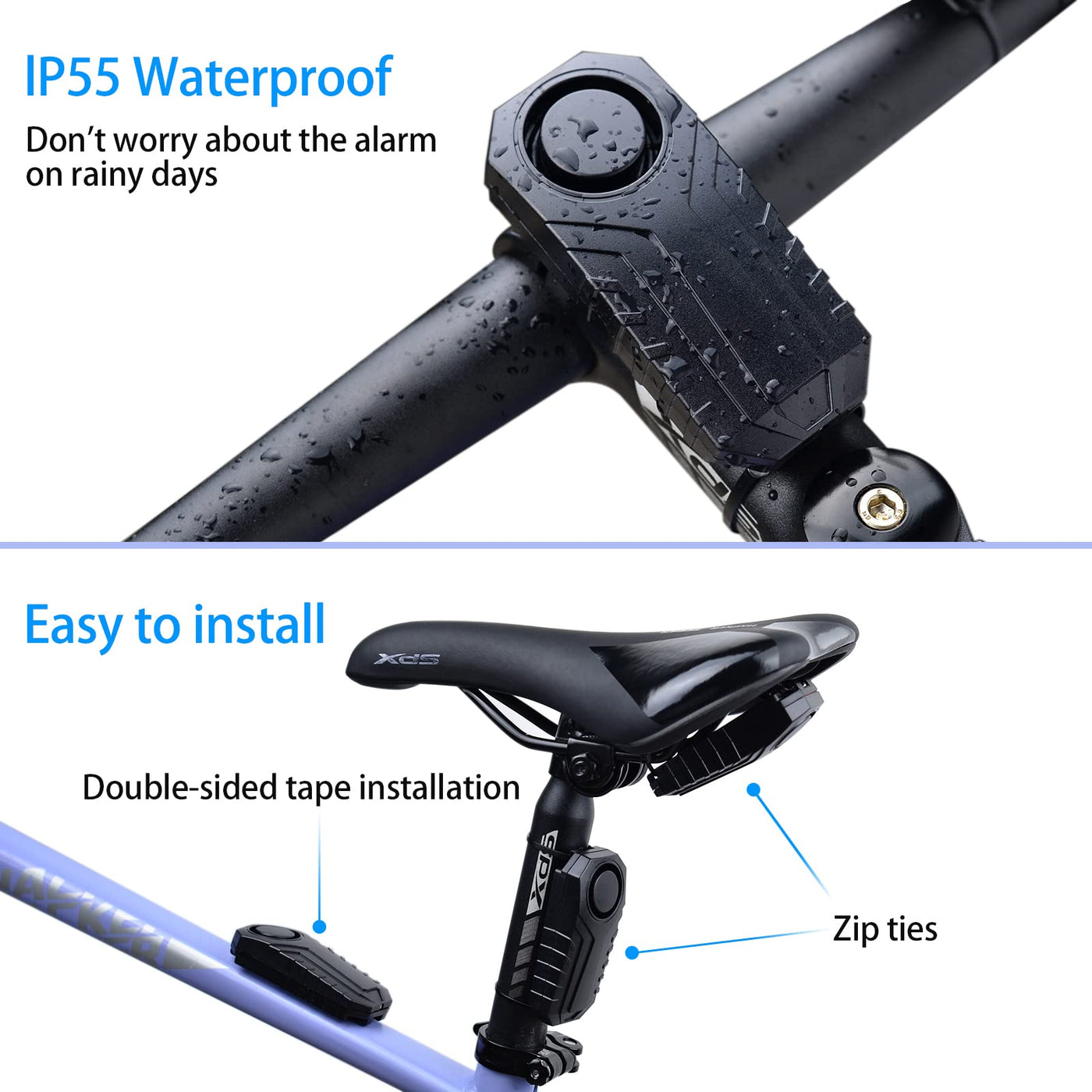 Q: How do I install the USUPERINK Bike Alarm?A: The bike alarm is easy to install with double-sided stickers and a strap, allowing for secure attachment without the need for screws or wiring. You can install it on various vehicles such as bicycles, motorcycles, and electric scooters.