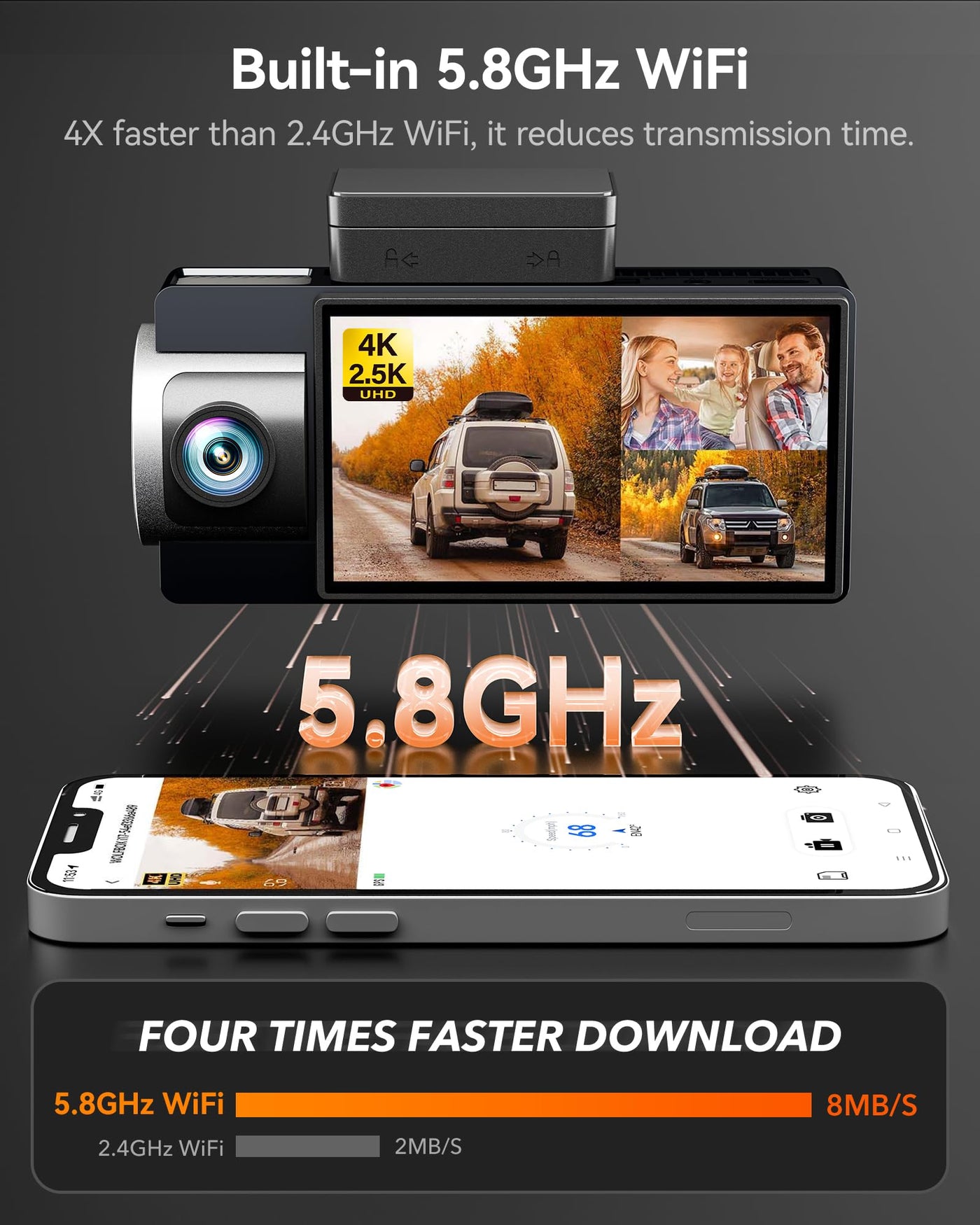 Wolfbox I17 4K 3 Channel Dash Cam, 5.8Ghz Wifi & Gps With 64Gb Card, 4K+1080P+1080P Dash Cam Front And Rear Inside, Triple Car C
