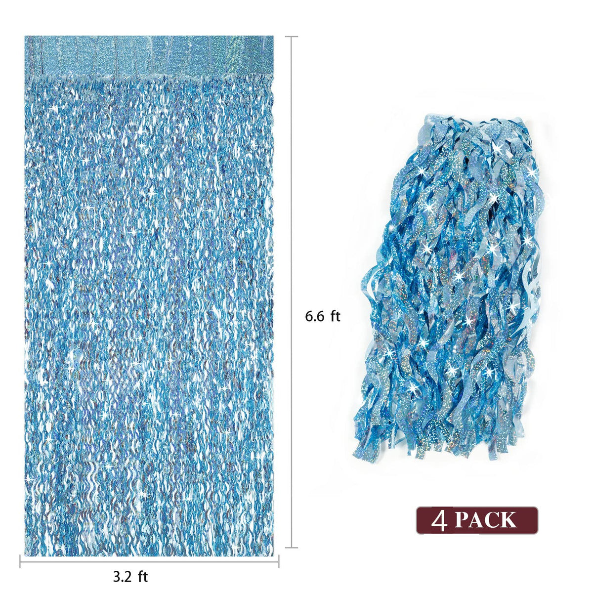 Q: What are the dimensions of each light blue party foil curtain?A: Each light blue tinsel foil fringe curtain measures 3.3 ft in width and 6.6 ft in height, making them perfect for creating an eye-catching backdrop.
