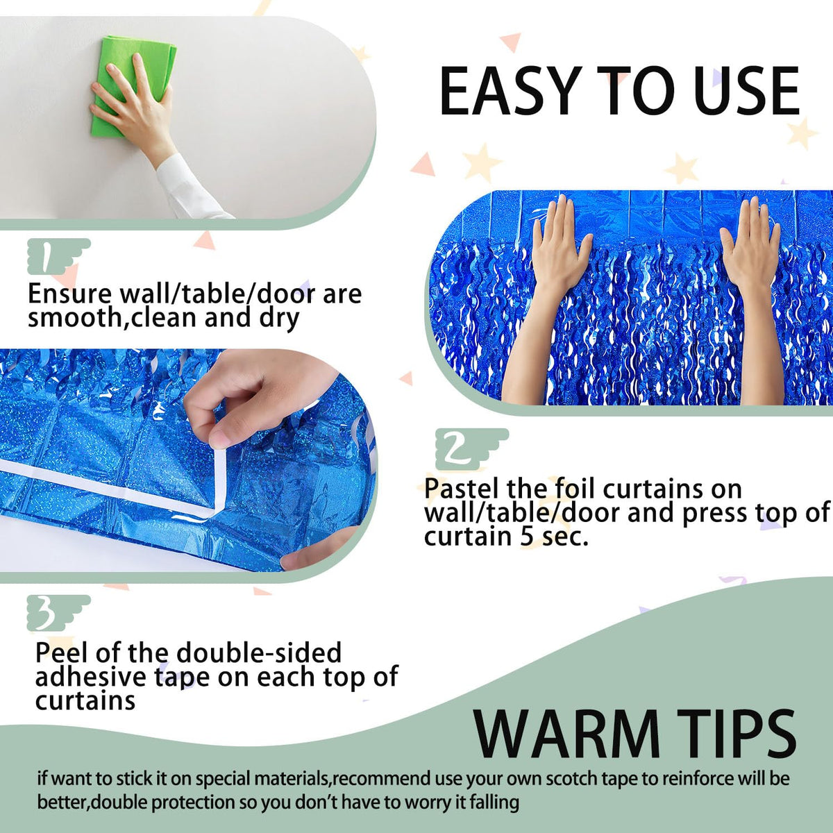 Q: How do I attach the foil fringe curtains to my wall or door?A: The foil fringe curtains come with double-sided tape on the back for easy attachment. Simply peel off the tape and stick the curtain to the desired surface.