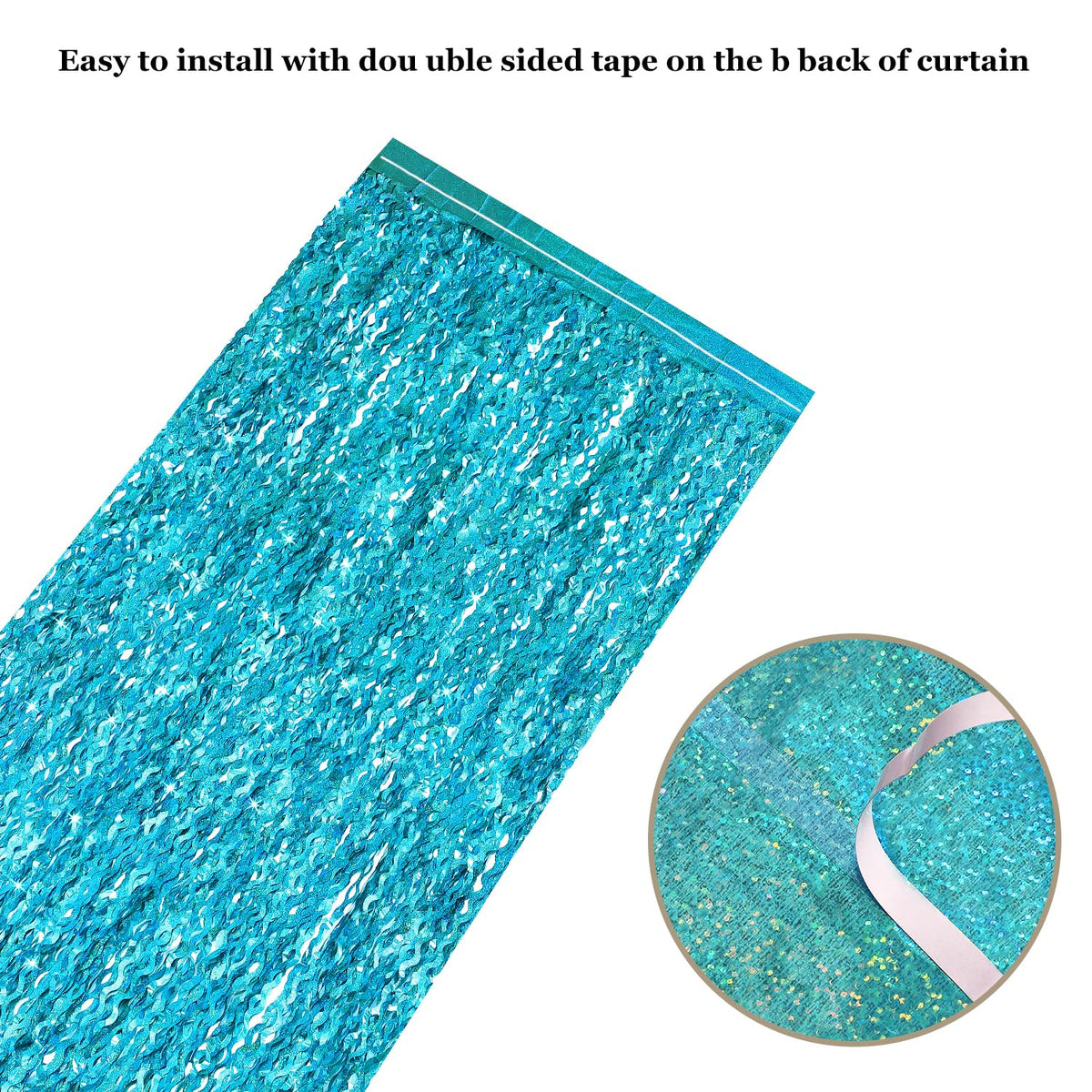 4 Pack Teal Aqua Blue Wavy Foil Fringe Curtains Party Decorations 3.3 Ft X 6.6 Ft Sparkle Streamer Tinsel Curtain Party Photo