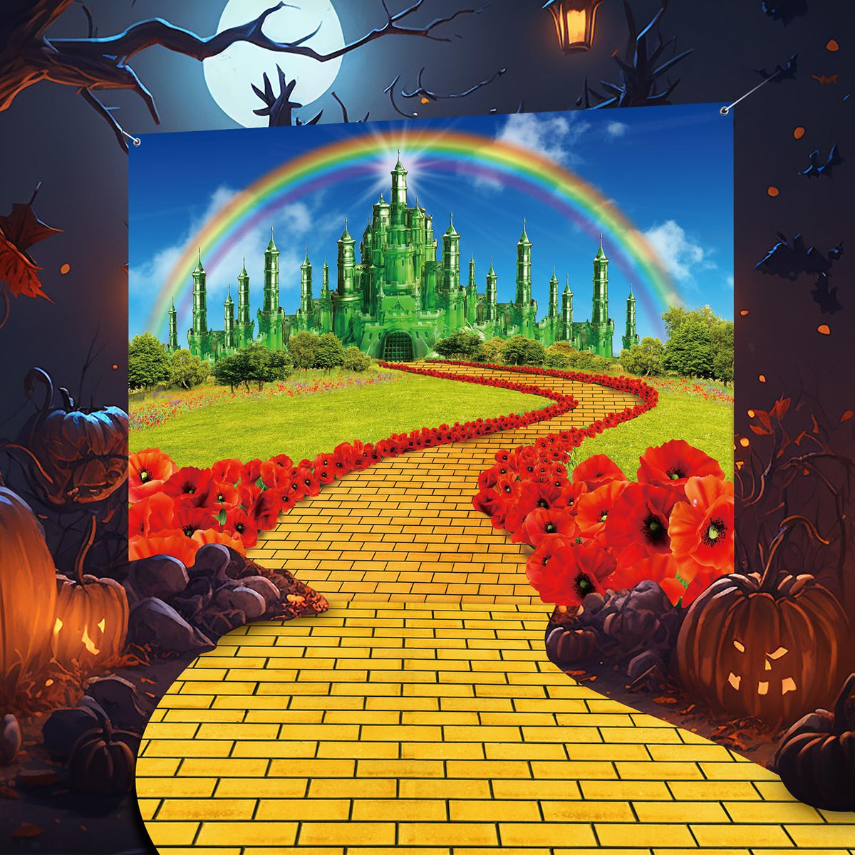 Q: What materials are used in the Yellow Brick Road Runner and Emerald Castle Backdrop?A: The Yellow Brick Road Runner is made of high-quality plastic that is waterproof and anti-tear, while the Emerald Castle backdrop is crafted from soft and lightweight polyester oxford fiber, making it easy to clean and durable.
