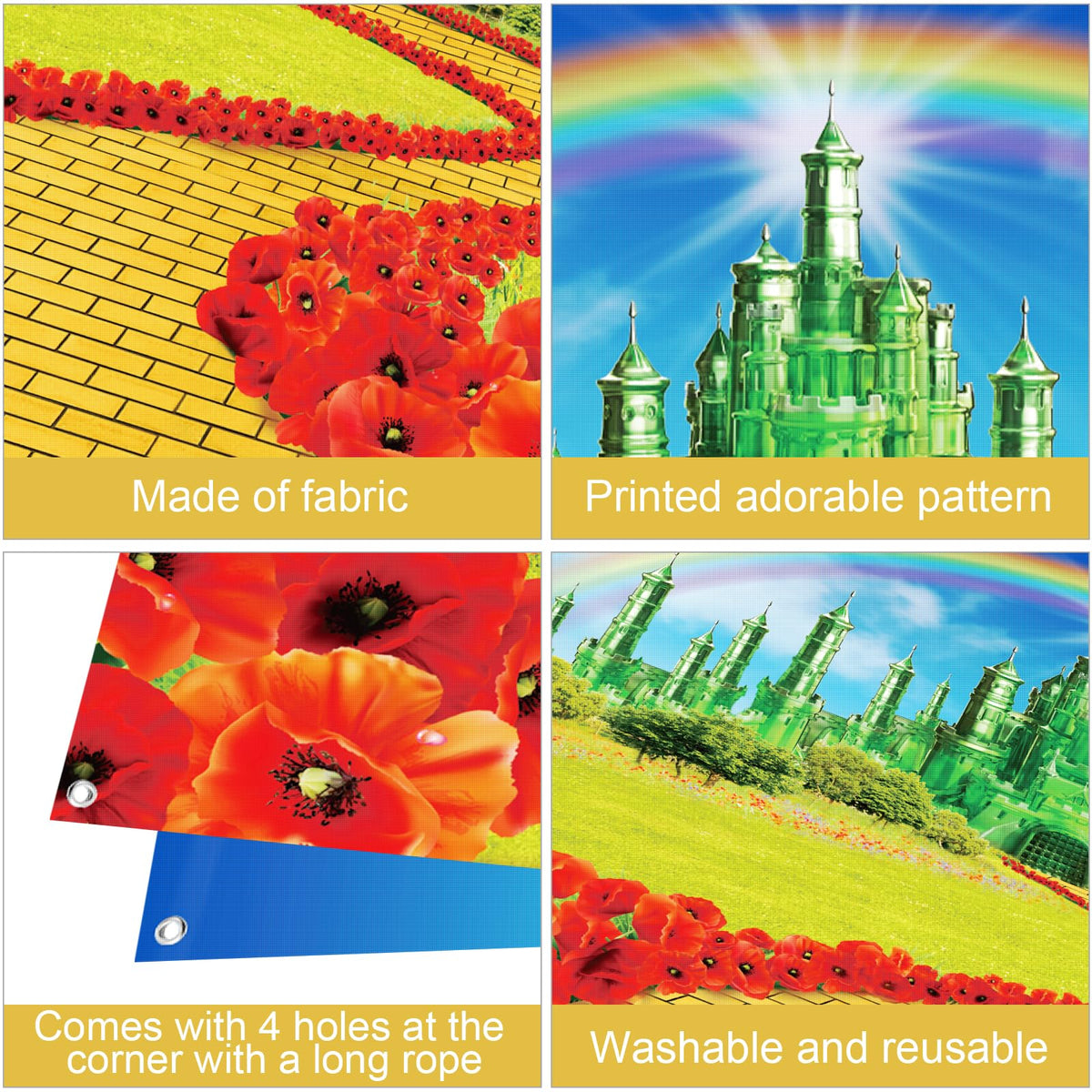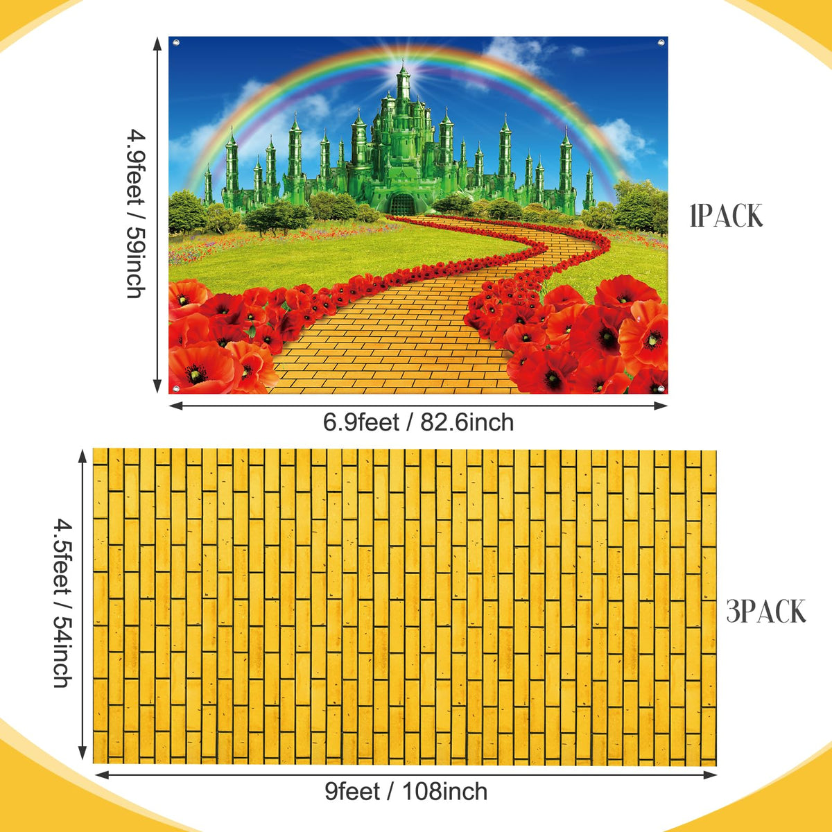 Q: What are the dimensions of the yellow brick road runner and emerald castle backdrop?A: Each piece of the yellow brick road runner measures approximately 4.5 x 9 feet, and the emerald castle backdrop measures about 72.8 x 43.3 inches.