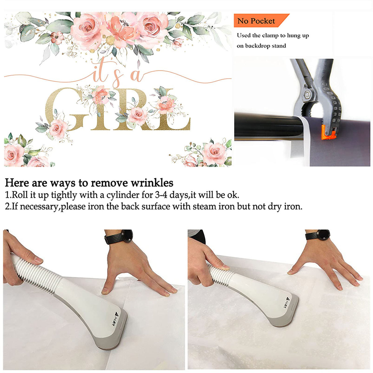 Q: How can I remove wrinkles from the backdrop?A: To remove wrinkles, you can roll the backdrop tightly with a cylinder for 3-4 days. Alternatively, you may gently iron the back surface with a steam iron, avoiding a dry iron, to achieve a smooth finish.