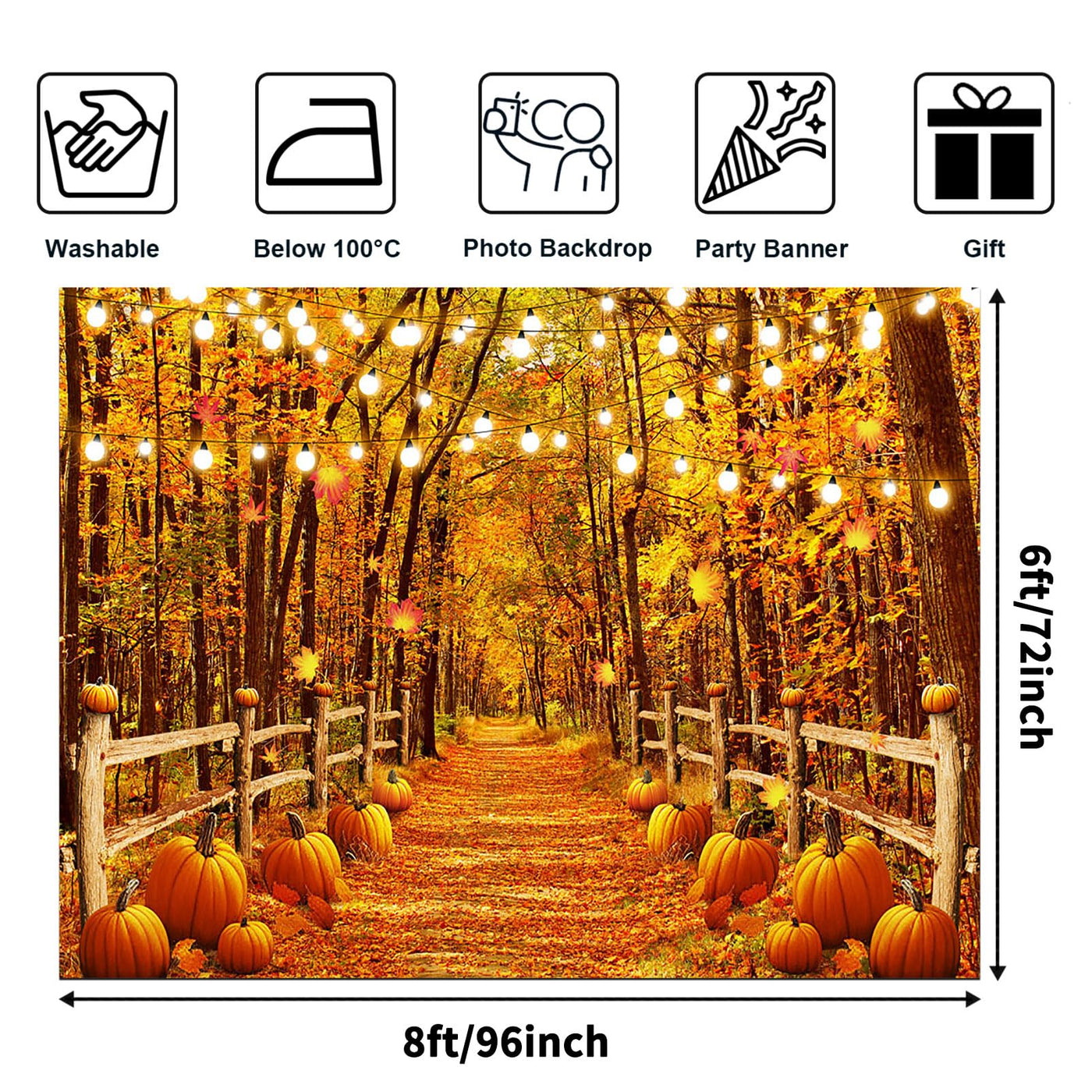Q: What is the size of the Avezano Fall Backdrop?A: The Avezano Fall Backdrop measures 8x6 ft (96 inches wide by 72 inches high), making it large enough for various party decorations and photoshoots.