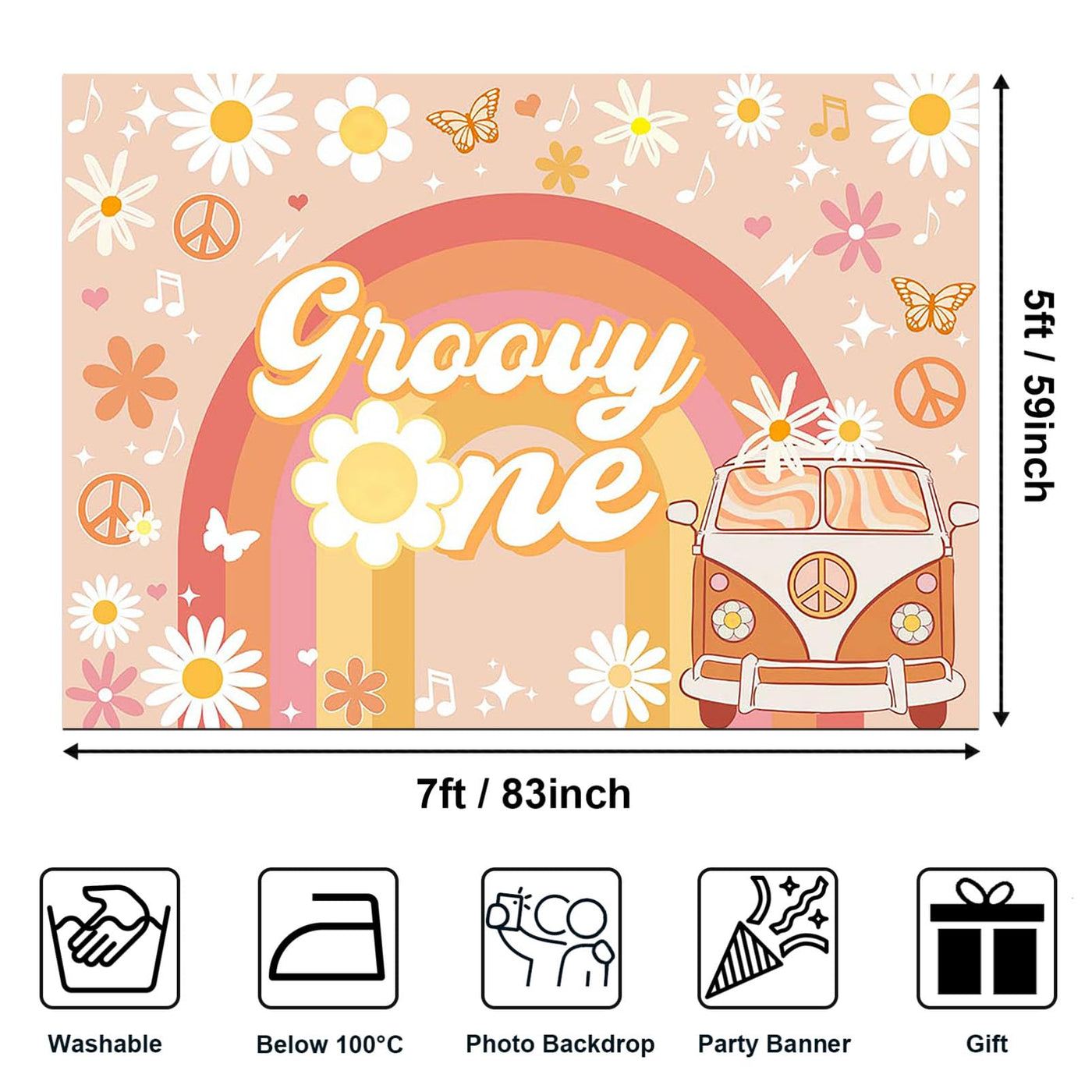 About Material:1. Our Backdrop Is Made From High-Quality Cotton Fabric: The Back Surface Can Be Ironed, Color Is Vivid, Not Easy To Fade; Lightweight And Easy To Carry And Store, Washable, Great For A Groovy One Birthday Party Photo Shoot 2. Features: This Photo Backdrop Is Lightweight And Non-Reflective. Easy To Carry And Store And Durable.3. Usage: It'S Suitable For Photography For Adults, Children, Newborn Baby, Toddlers, Lovers Families, Perfect For Tv/Film Production, All Kinds Of Weddings, Parties, Events, Festivals, Activities, And Artistic Portraits.Warm Tips:1. This Photo Background Is Not Waterproof!2. This Backdrop Can Be Fixed To The Wall Using Clips, Nails, Or Tape.&Nbsp;3. Keeping A Certain Distance From The Backdrop When Taking Pictures Will Increase The Clarity Of The Background Image.4. Because This Product Will Be Delivered Folded, It Will Inevitably Make Wrinkles. Here Are Some Tips To Help You Minimize These Wrinkles:&Nbsp;A. Roll It Up Tightly With A Cylinder For 3-4 Days, It Will Be Ok.&Nbsp;B.Stretch It And Clamp It To A Backdrop Stand For 3-4 Days, It Also Works.&Nbsp;C. Please Iron The Back Side (Not The Image Side) At Low Temperature To Easily Reduce The Wrinkle. To Avoid Possible Steam Damage, Place A Layer Of Dry Cloth Between The Backdrop And The Iron.