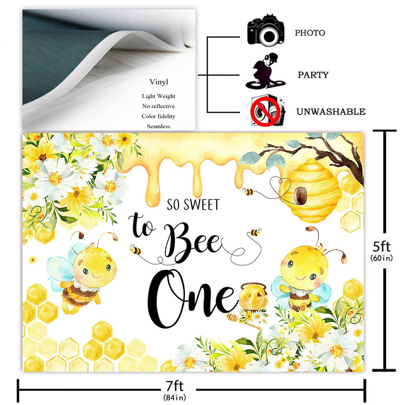 Q: What are the dimensions of the Avezano Sweet Bee backdrop?A: The Avezano Sweet Bee backdrop measures 7x5ft (84 inches wide by 60 inches high), making it large enough to accommodate multiple people for party decorations and photos.