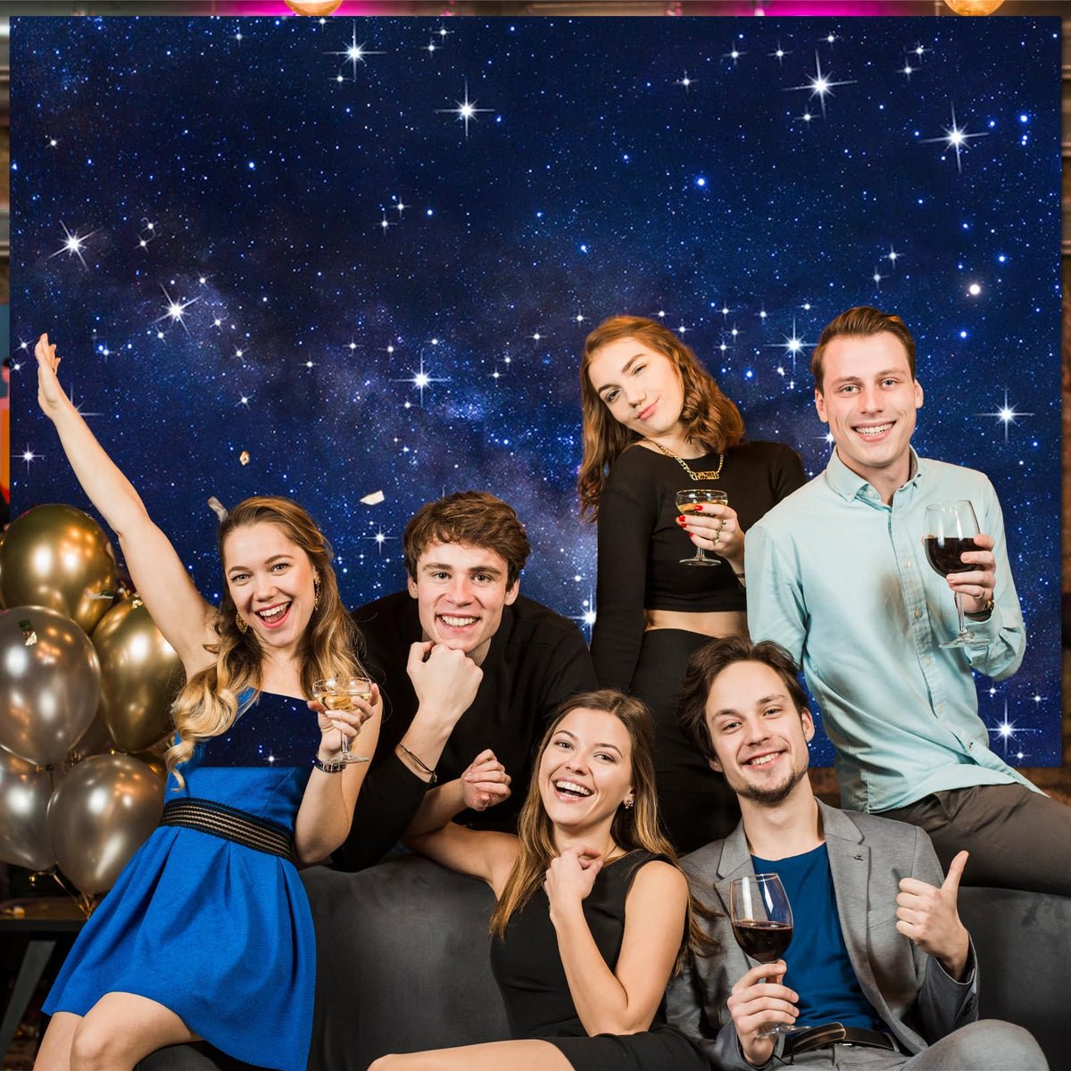 Q: What are the dimensions of the Avezano Starry Night Sky Backdrop?A: The Avezano Starry Night Sky Backdrop measures 10 feet in width and 7 feet in height, making it ideal for various party themes and photo booth settings.