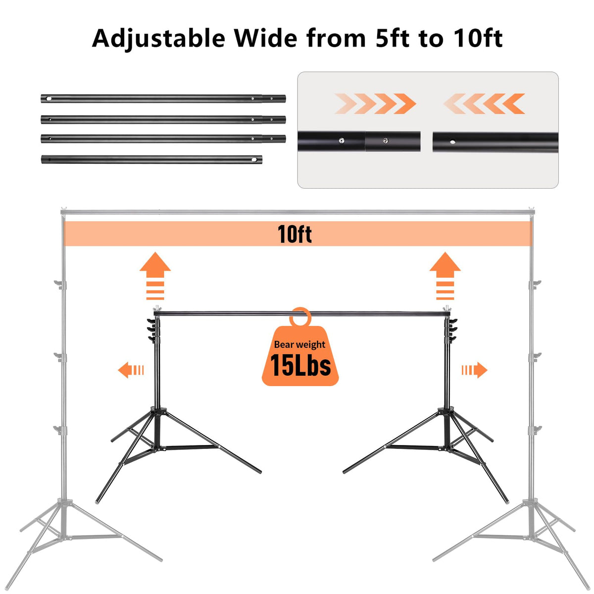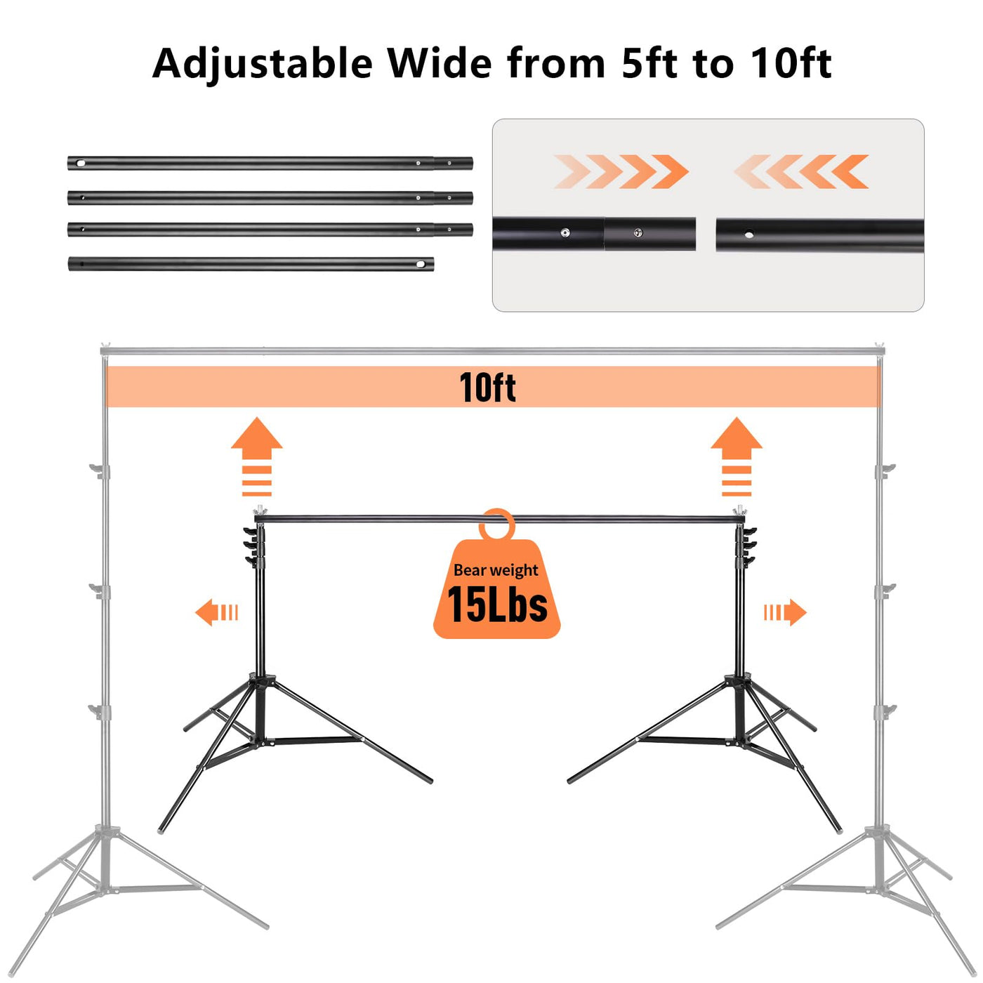 Note: Balloons, Colorful Decorations Are Not Included. Meaningful Family Gathering, Cheerful And Memorable Birthday Party, Romantic And Warm Wedding, Professional Photography, Attractive Advertising Display And Other Uses, Just Get 8.5*10 Ft Backdrop Stands! | Adjustable Stable Backdrop Stand: Loading Capacity Up To 11Lb/5Kg, Good Flexibility With Width (4Ft.�10Ft.) & Height (2.7 Ft.�8.5 Ft.) | Heavy Duty Spring Clamp And Backdrop Elastic String Clip: Used To Holds Curtains, Canvas, Muslin, Projector Screen Or Seamless Paper, Prevent Background Slippage. | Photography Weight Sandbag:To Stabilize The Backdrop Support System. (Note: This Bag Comes Empty, Loading Capacity Is About 8.8 Lb.)? | The Kit Includes: [4 Pcs] Crossbar Parts / [2 Pcs] Tripod Bracket / [3 Pcs] Spring Clamp / [2 Pcs] Backdrop Elastic String Clip / [2 Pcs] Sand Bag / [1 Pc] Carry Bag
