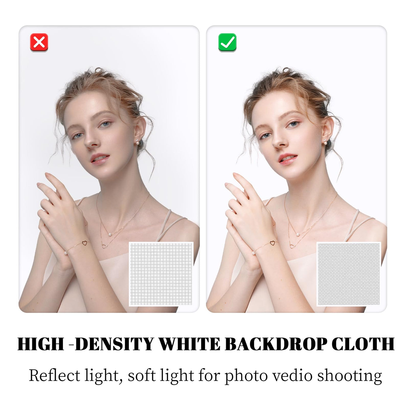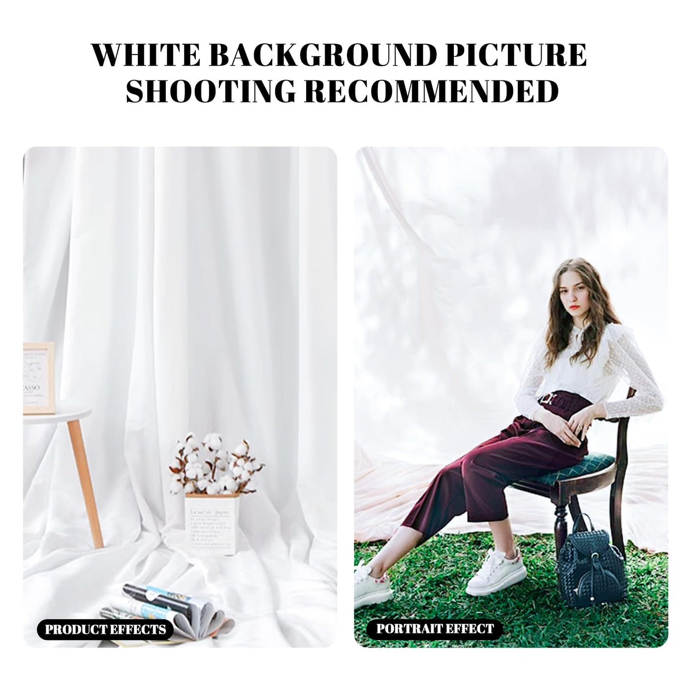 Q: What materials is the white backdrop made from?A: The backdrop is made from high-quality cloth material that is durable, lightweight, and can be used on both sides. It is also washable, ironable, and foldable.