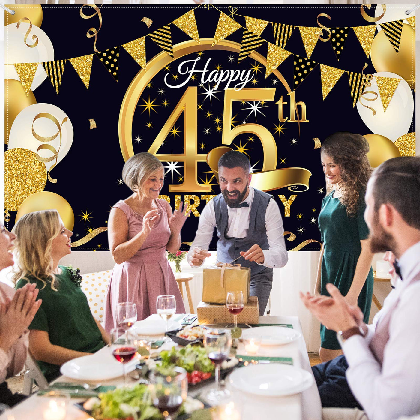 Q: What are the dimensions of the Birthday Party Decoration Poster?A: The dimensions of the Birthday Party Decoration Extra Large Fabric Black Gold Sign Poster are 72.8 x 43.3 inches (185 x 110 cm), making it a perfect size for a backdrop at various celebrations.