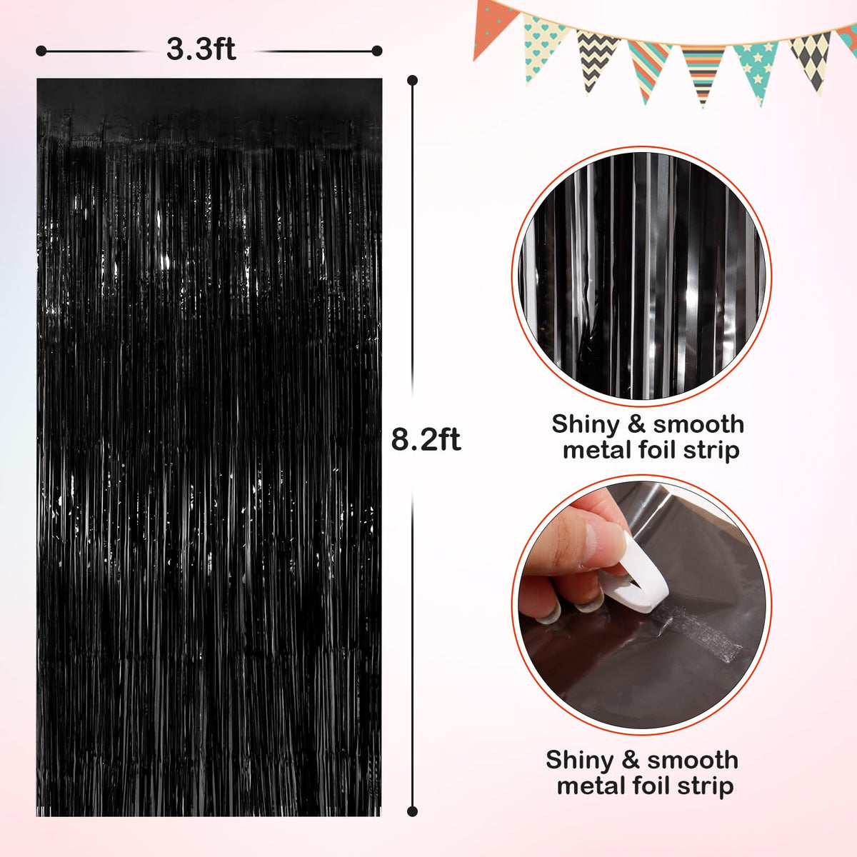 Q: What size are the curtains and how many come in a pack?A: Each pack contains 2 curtains, each measuring 3.3 feet by 8.3 feet. This size makes them suitable for a wide range of decorations, from small gatherings to larger celebrations.