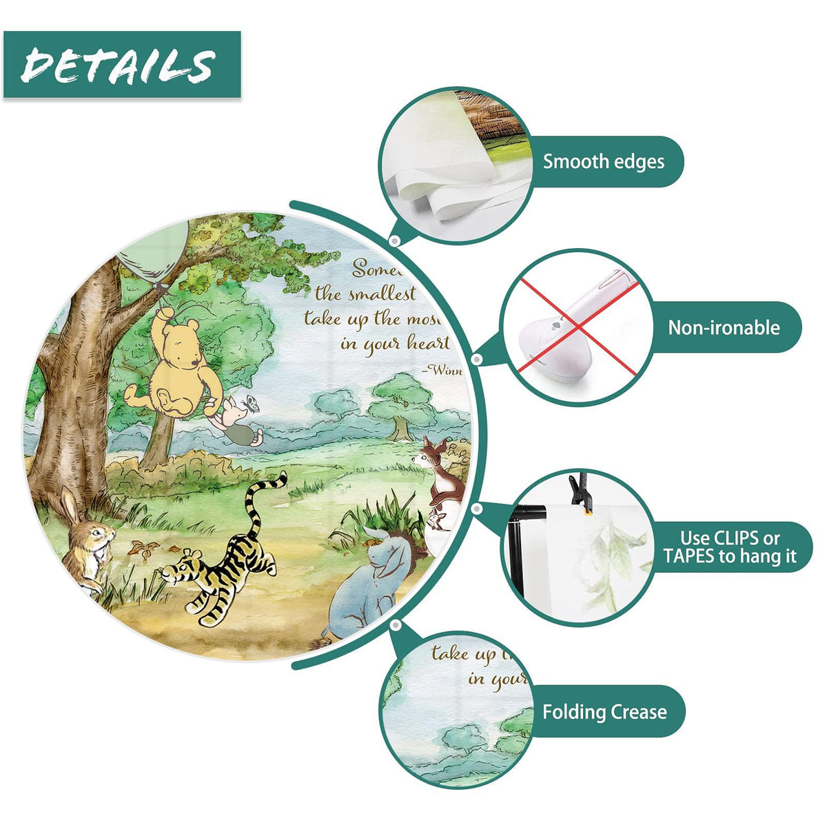 Q: How do I take care of the backdrop to avoid wrinkles?A: To reduce wrinkles, if necessary, you can iron the back side of the backdrop (not the image side) with low temperature. Place a layer of dry cloth between the backdrop and the iron to prevent steam damage.