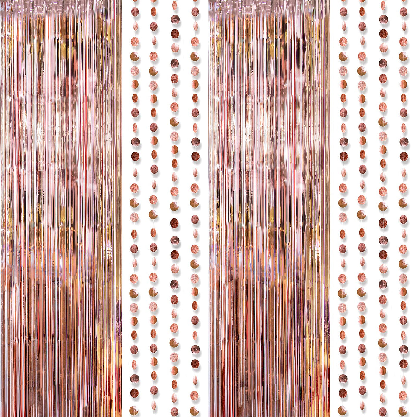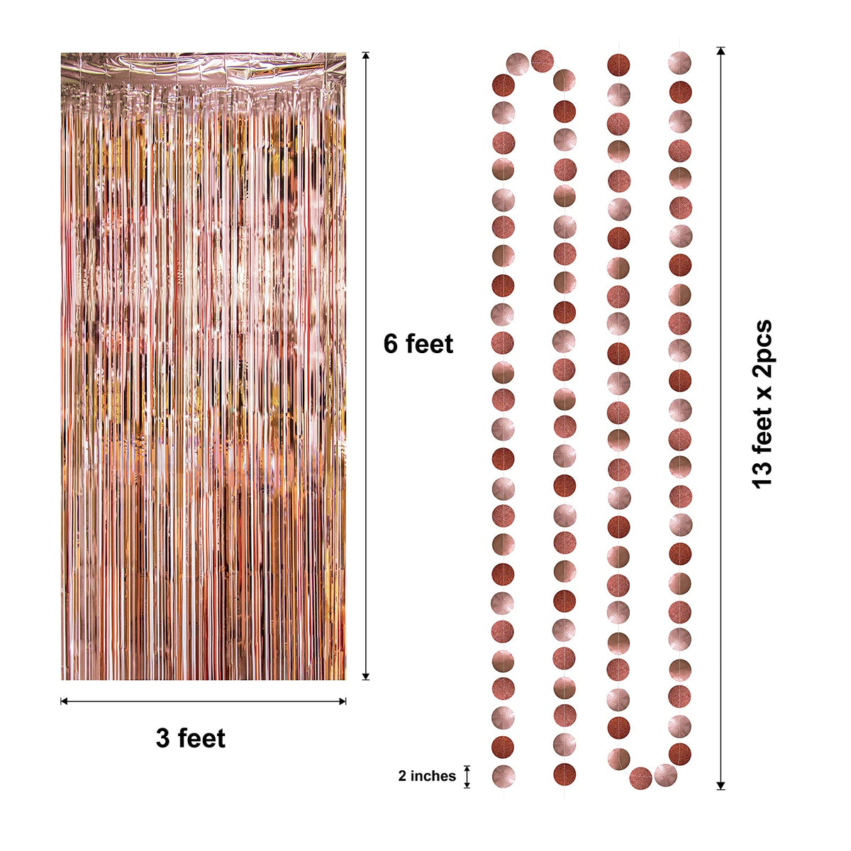 Decor365 Rose Gold Tinsel Foil Curtain Backdrop With Circle Dot Garland Kit - Includes 2 Pc Of 3.3 X 6.6 Ft Flashing Rose Gold Tinsel Foil Curtain And 4 Strings Of Glittering Shiny Rose Gold Circle Garlands, Each Of 13 Ft Long. Each Paper Circle Measures About 2 Inches In Diameter. - Made With High Quality Synthetic Foil And Card Paper, Sturdy String And Long-Lasting Color And Coating. - No Diy Needed. Easy To Use At Home Or Party. Environmental Friendly And Easy To Remove And Reuse. Fits Multiple Occasions And Settings: - Proposal, Wedding, Engagement Decoration - Bachelorette, Hen Party, Bridal Shower Decoration - Baby Shower, Bday/Birthday, Sweet 16 Decoration - Home, Shop Showcase Decoration - Kids' Room, Teenage Girls' Room Decoration