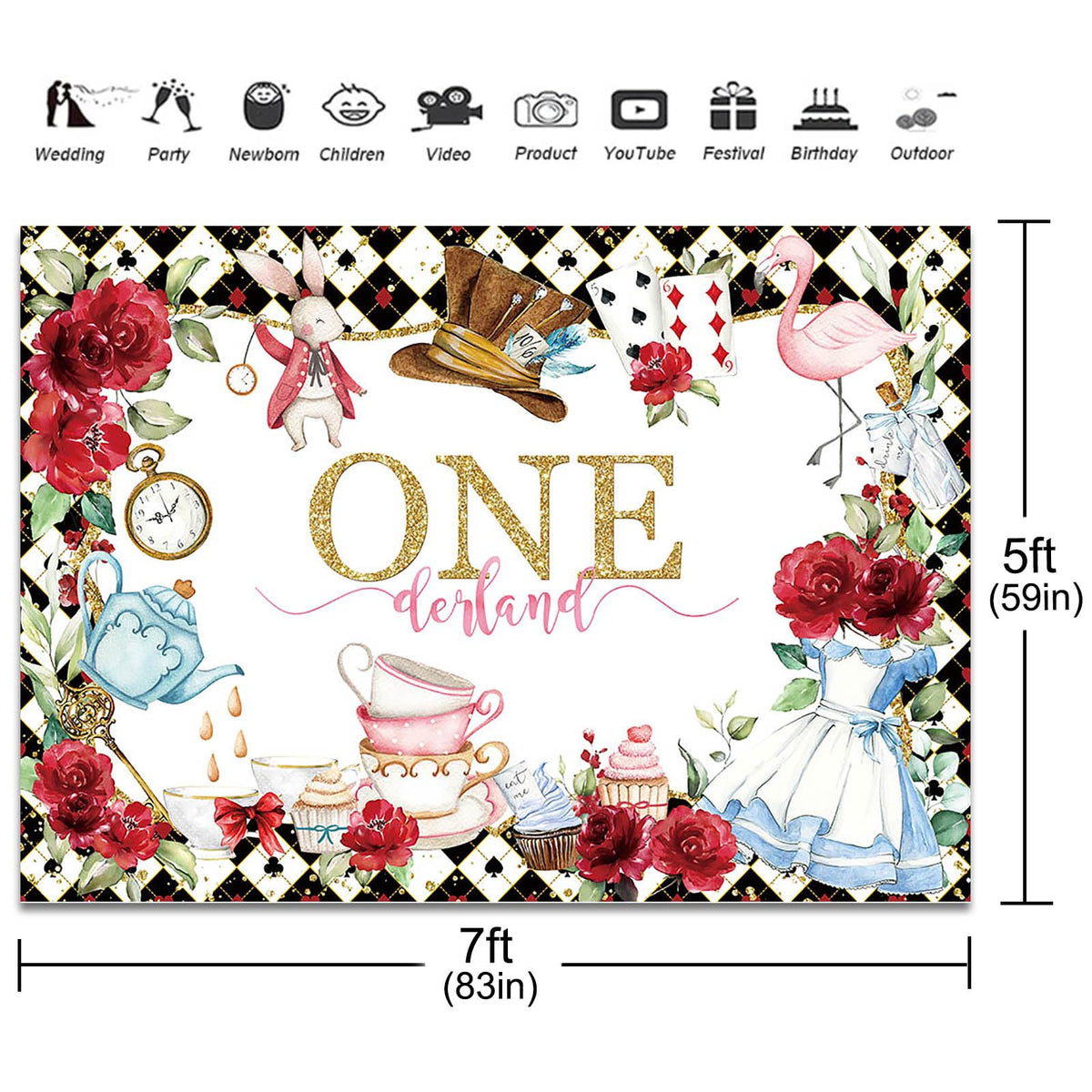 Q: What is the size of the Fitumiw Wonderland 1st Birthday Backdrop?A: The backdrop measures 7 feet in width and 5 feet in height (210 x 150 cm), making it a perfect size for children's birthday celebrations.