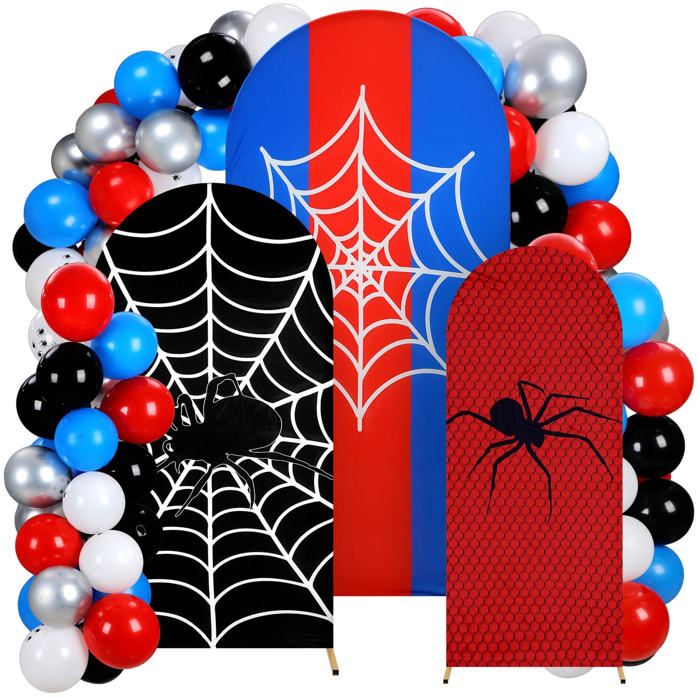 Foilswirl 34 Pcs Spider Birthday Party Decorations 3 Spider Web Arch Backdrop Covers (4/5/6ft) Web Spandex Arch Cover with 30 Re