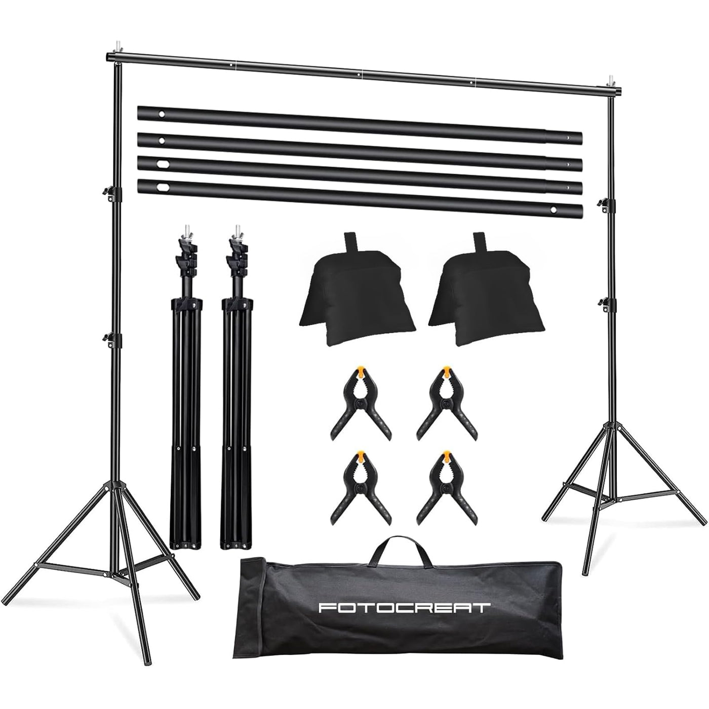 Fotocreat Backdrop Stand Kit 2X3M/6.5X10Ft Backdrop Support System Frame:Comes With 2 Adjustable Backdrop Stands, 4 Crossbars,4 Backdrop Clamps And Carrying Bag.Sturdy Tripod Adjustable Height (2.7Ft/0.82M-6.6Ft/2M) The Aluminum Alloy Backdrop Stand Is Durable With Load Capacity Up To 11Lb/5Kg. 4 Sections Retractable Crossbar Maximum Adjustable 3M/10Ft,The Tube Diameter Is 2.5 Cm/0.08Ft.The Background Stand Can Adjust To The Appropriate Width As Required To Adapt To Different Sizes Of Background Backdrop,Curtains Or Banner.This Heavy Duty Backdrop Stand Are Very Versatile, They Are Suitable For A Variety Of Different Scenarios And Can Be Used Photo Studio Photography Or Portrait Photoshoot, Video Shooting, Live Recording, Balloon Arch,Etc. This Background Support System Frame Kit Very Sturdy And Doesn'T Shake.So It Can Be Used As Projector Screen Stand,Balloon Arch Stand,Banner Stand And Curtain Stand,Hang A Variety Of Party Decorations. The Back Drop Stand Kit Is Suitable For Wedding Parties,Birthday,Newborn Baby Photoshoot,Product Display Background,Diy Photo Booth,Baby Shower,Pet Pictures Listing Adjustable Backdrop Stand 2-Pack 4 Crossbars 4 Backdrop Clamps Carrying Bag