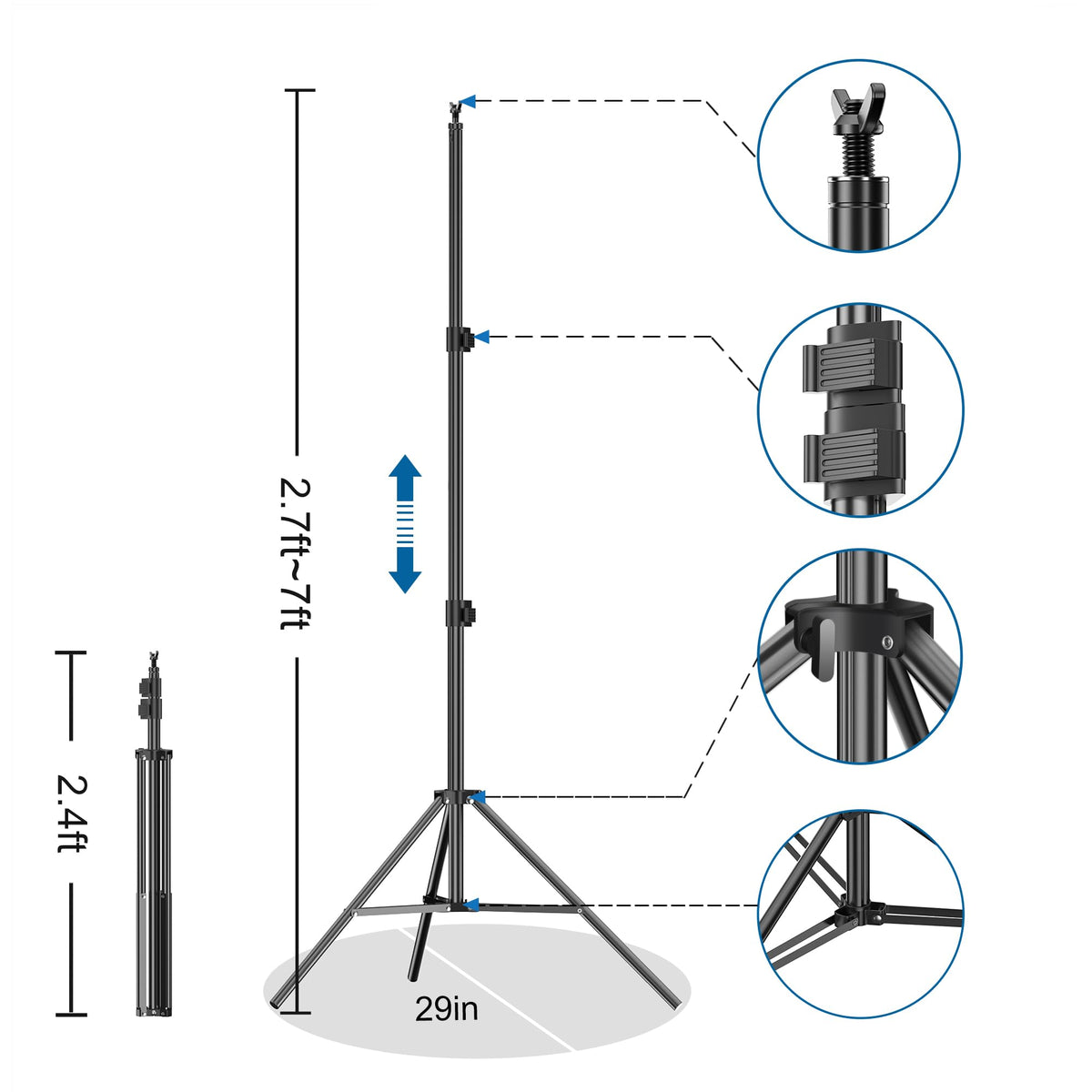 Features:Fudesy Lightweight Adjustable Photo Video Background Support System,Aluminum Alloy Construction,Sturdy And Stable.Ideal For Photo Studio,Video Shooting,Youtube,Wedding,Party.One Male And Another Female Crossbars Can Be Expanded, Length Adjustable From 5.2Ft To 10Ft(2Pcs Connected).2Pcs 7Feet Light Stand Able To Be Adjusted Height Within 2.7 To 7Ft.Folded Size Only 2.4Ft.Included 4Pcs Spring Clamps To Hold The Background.Size:3.1Inch X 4.5Inch,Max Openning:2Inch.Easy And Quickly To Set Up And Disassemble,Come With A Portable Nylon Carry Bag ,Convenient For You To Transport.We Provide You 24-Hours Online Service,30-Day Money-Back And 1-Year Warranty.Please Feel Free To Contact Us In Any Time If There Are Any Issues.Technical Specs:(2) X 7 Feet Adjustable Light Standmaterial:Aluminum Alloy Constructionfolded Height:2.4 Feetmin Height:2.7 Feetmax Height:7 Feetdiameter Of Legs: F0.63Segments: 3Color: Black(2) X Extensible Crossbarsmaterial:Aluminum Alloy Constructiondiameter:F1Min Length:5.2Ftmax Length:10Ft(4) X Spring Clampmaterial:Nylonsize:3.1Inch X 4.5Inchmaximum Opening: 2 Inch(6) X Ring Clip(4) X Background Clip(1) X Porble Carry Bag With Hook And Looppremium Quality Nylon Materialable To Contains All Components,Convenient For You To Carry
