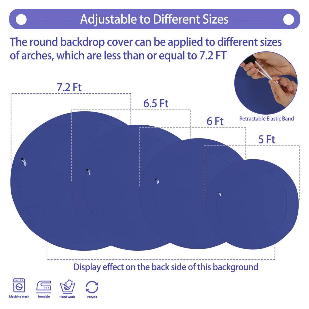 Q: What sizes of arch stands are compatible with the GALLETY Navy Blue Round Backdrop Cover?A: The GALLETY Navy Blue Round Backdrop Cover is designed to fit arch stands ranging from 5 to 7.2 feet in diameter. Its adjustable design ensures a seamless fit for various sizes.