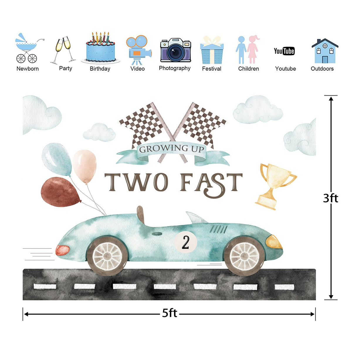 Glawry Two Fast 2Nd Birthday Backdrop For Photography 5Wx3H Feet Boys Kids Boho Watercolor Race Car Cartoon Balloons Cup Cool Cl