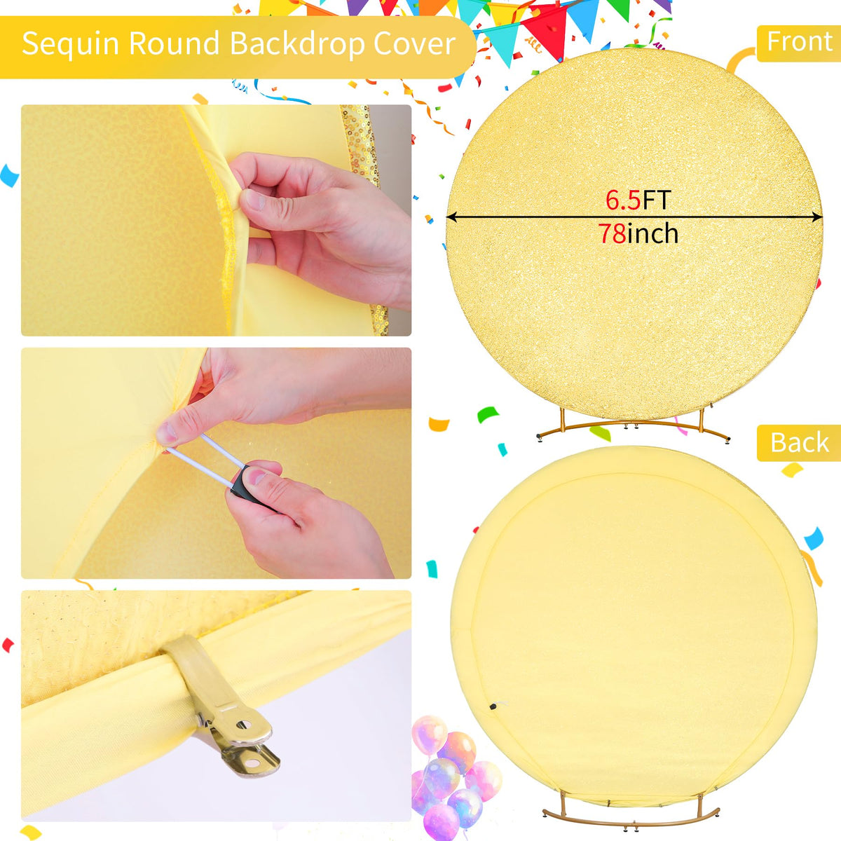 Q: Is the Gold Sequin Round Backdrop Cover easy to install?A: Yes, the backdrop cover features a unique elastic design that allows for easy and quick installation. The elastic band on the back side can be adjusted to fit securely on the stand.