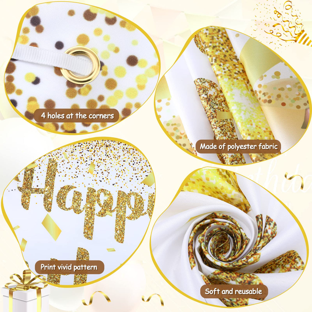 Product Specifications: Material: 100D Polyester Backdrop Size: 180*110Cm / 70.8 * 43.3 Inch Features: ?[Washable And Resuable]-Gold And White Happy Birthday Banner For Women Girls Is Made Of Durable Polyester,&Nbsp; Lightweight, Foldable, And Washable. Easy To Carry And Reused Many Times. ?[Wide Application]- The Gold White Birthday Decorations Banner Can Be Used To Decorate Various Occasions, Such As Gold Theme Birthday Parties, And Home Garden Yard Party Decorations. Besides, It Can Also Be Used As A Table Cloth, Photography Props, And So On Notice: 1. Since The Manual Measurement Is Required, Please Allow A Difference Of 1-3 Cm, Thank You For Your Understanding! 2. Due To The Difference Between Different Monitors, Please Note That The Picture May Not Reflect The Actual Color Of The Item. Package Included: 1 *Gold And White Happy Birthday Banner 1*&Nbsp; Rope