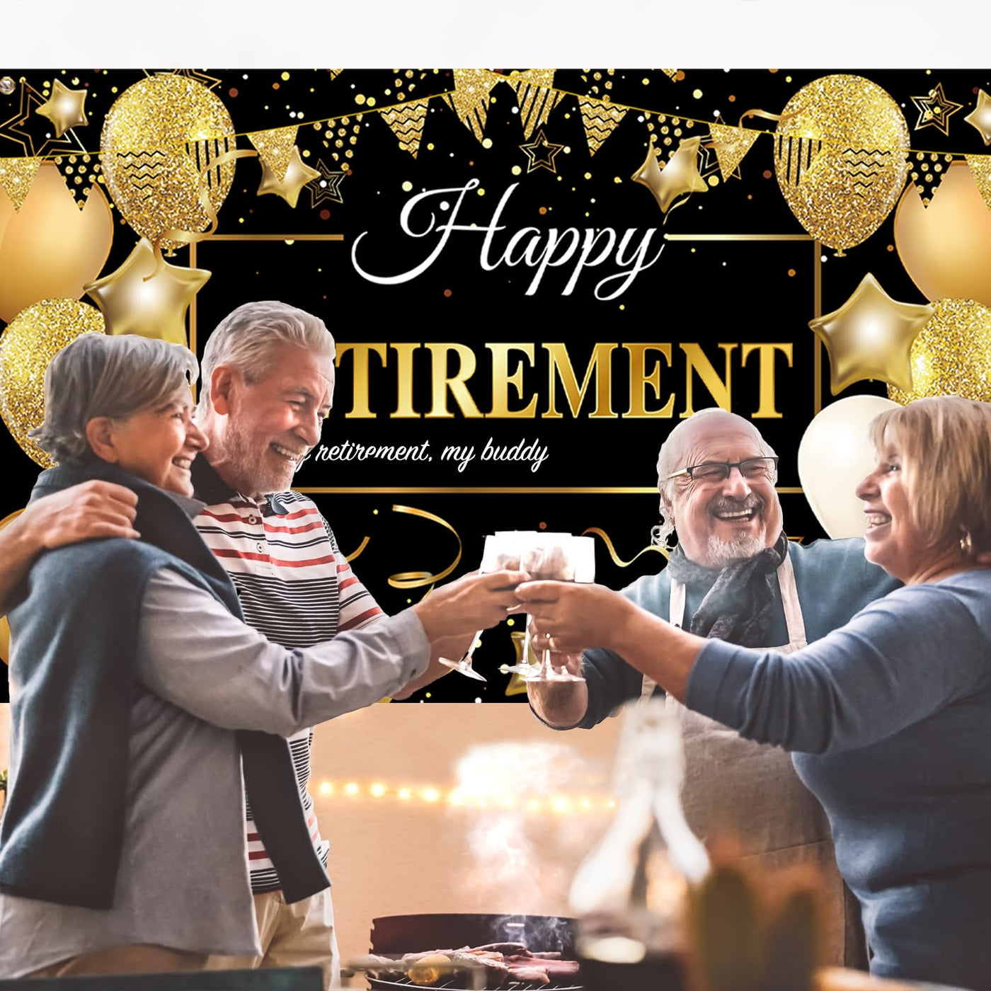 Q: Is the design of the banner suitable for all types of retirement parties?A: Absolutely! The elegant black and gold design of the banner is versatile and suitable for various retirement celebrations, including corporate and military retirements.