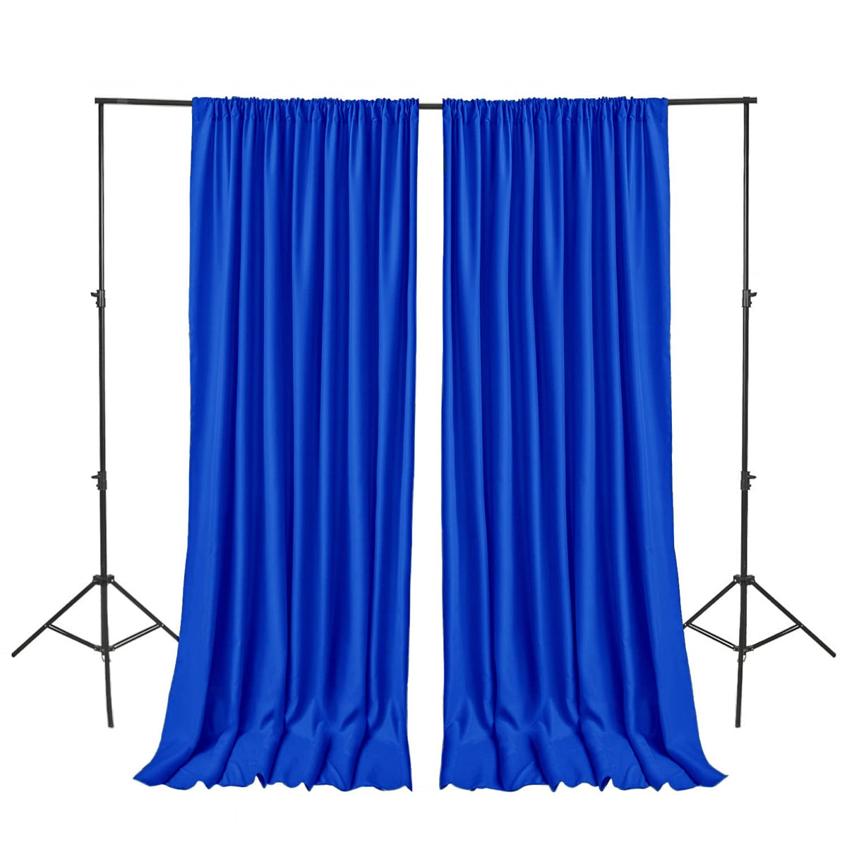 Q: What are the dimensions of the Hiasan Neon Blue Backdrop Curtains?A: The Hiasan Neon Blue Backdrop Curtains come in two panels, each measuring 5 feet wide by 7 feet high. When combined, the entire backdrop measures 10 feet wide by 10 feet high.