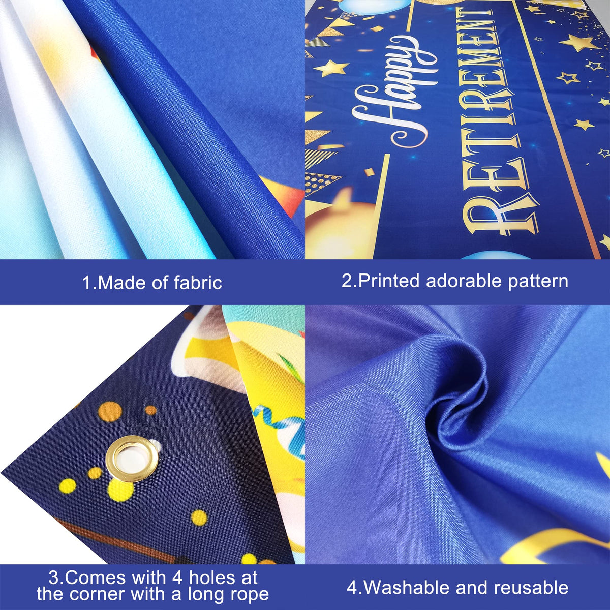Q: Is the retirement banner reusable and weather-resistant?A: Yes, the banner is made from Grade 'A' quality cloth fabric, which is both reusable and water-resistant, ensuring durability for outdoor events.