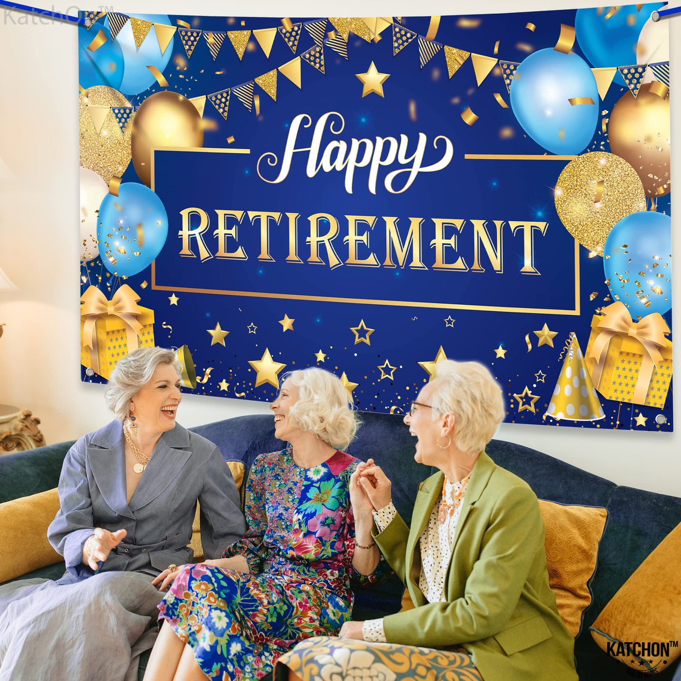 Q: What colors does the banner feature?A: The KatchOn Happy Retirement Banner features a vibrant blue and gold color scheme, which adds a luxurious and eye-catching element to your retirement decorations.