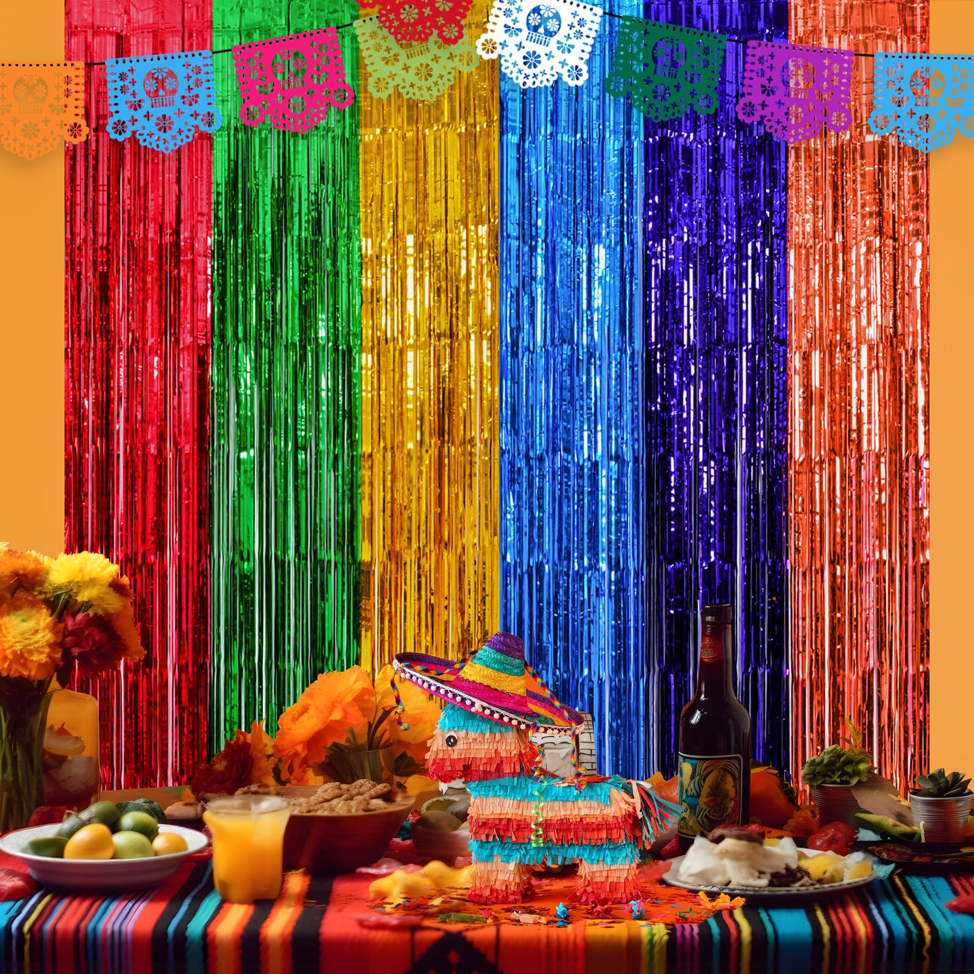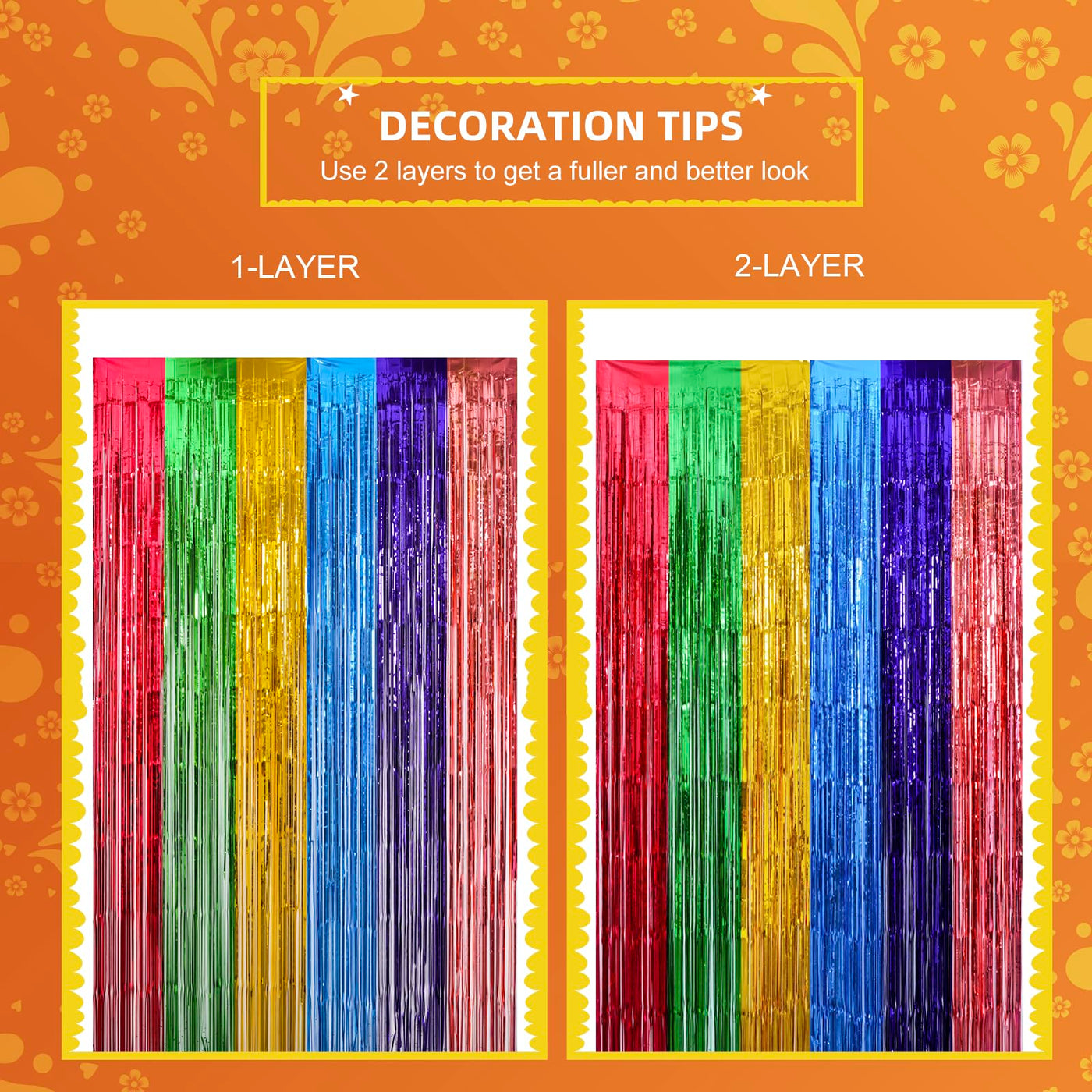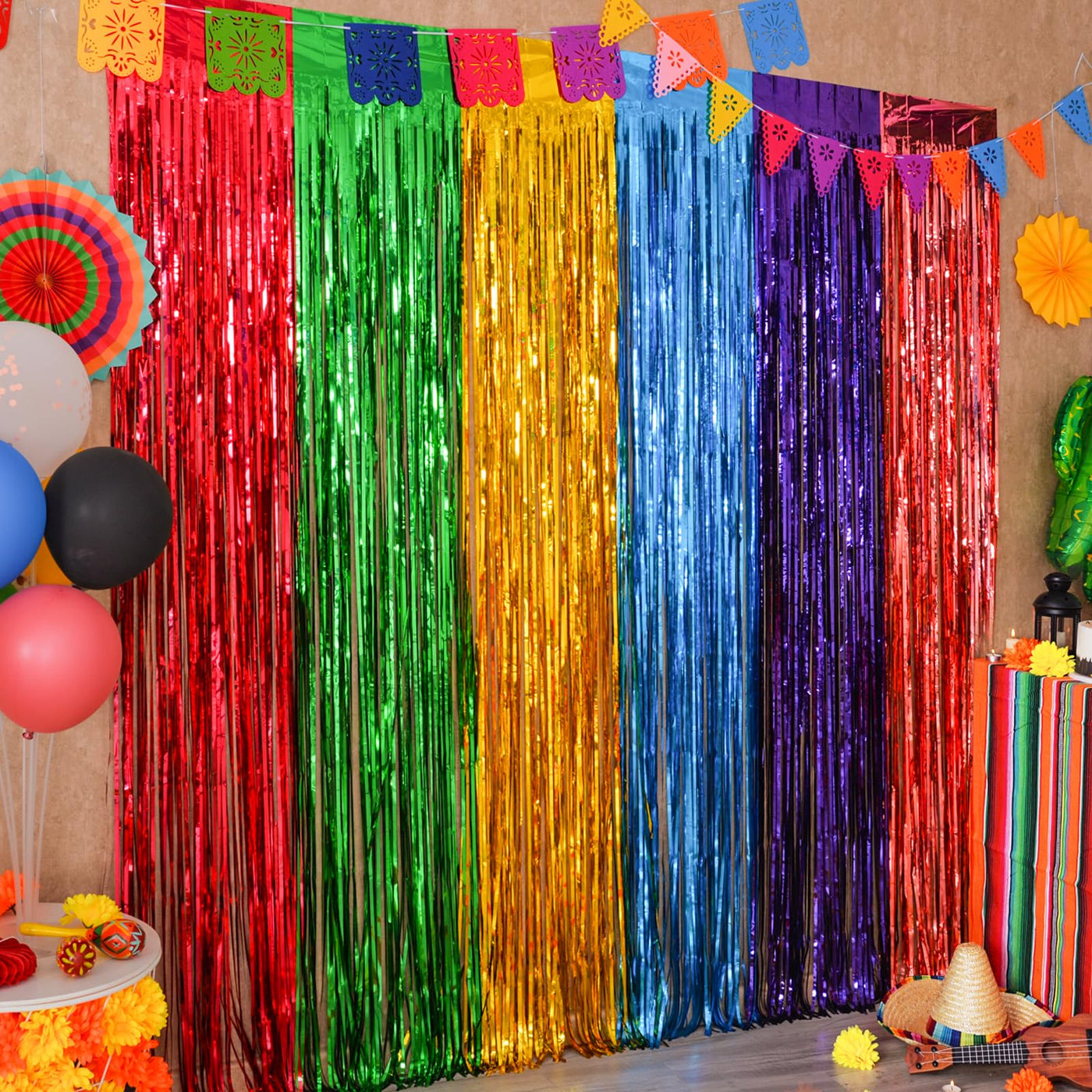 Product: 4 Pack Of Fiesta Party Photo Booth Backdrop, Mexican-Themed Party Foil Fringe Curtainscolor: Red, Green, Yellow, Blue, Purple, Orange Size: (Width X Drop) 3.3 X 6.6 Ft Eachapplications: Live Streamer Backdrop,Cinco De Mayo Party, Dia De Los Muertos Decor, Day Of The Dead Decorations, Broadcast Streamer Backdrop, Mexican Themed Party Photo Backdrop, Dessert Table Backdrop, Stage Backdrop, Disco Backdrop, Bar Backdrop Spain Classroom Decor,Hispanic Heritage Month Decorations, Etc.