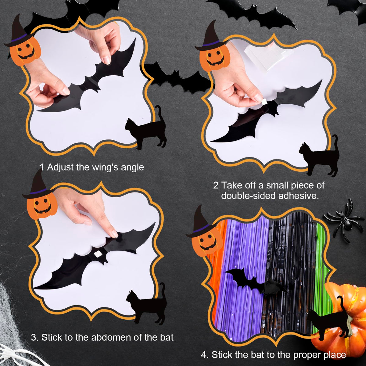 Q: How do I install the foil fringe curtains for my Halloween party?A: To install the foil fringe curtains, simply tear off the double-sided adhesive tape and stick them to the desired location such as doorways, windows, walls, or as a backdrop for your Halloween party.