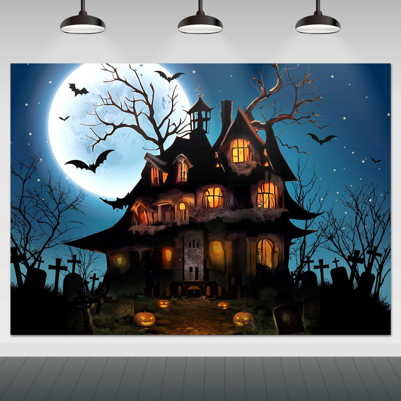 Mocsicka Halloween Backdrop For Photography Blue Night Moon Haunted House Background Spooky Cemetery Hollween Costume Party Deco