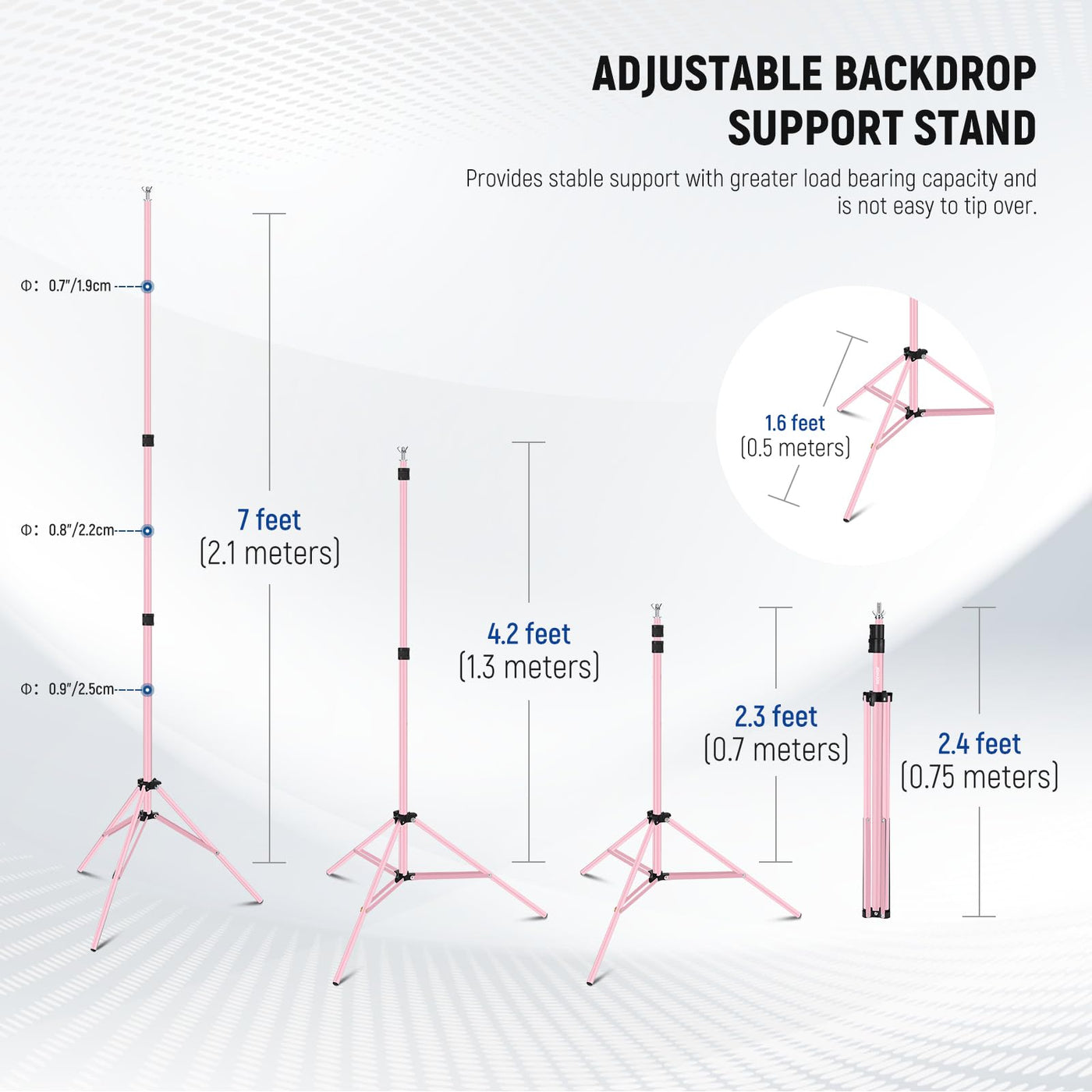 Q: Can the height and width of the backdrop stand be adjusted?A: Yes, the backdrop stand is adjustable in height from 2.3' to 7' (70cm to 2.1m) and in width from 5' to 10' (1.5m to 3m), allowing you to customize it for different backgrounds and shooting environments.