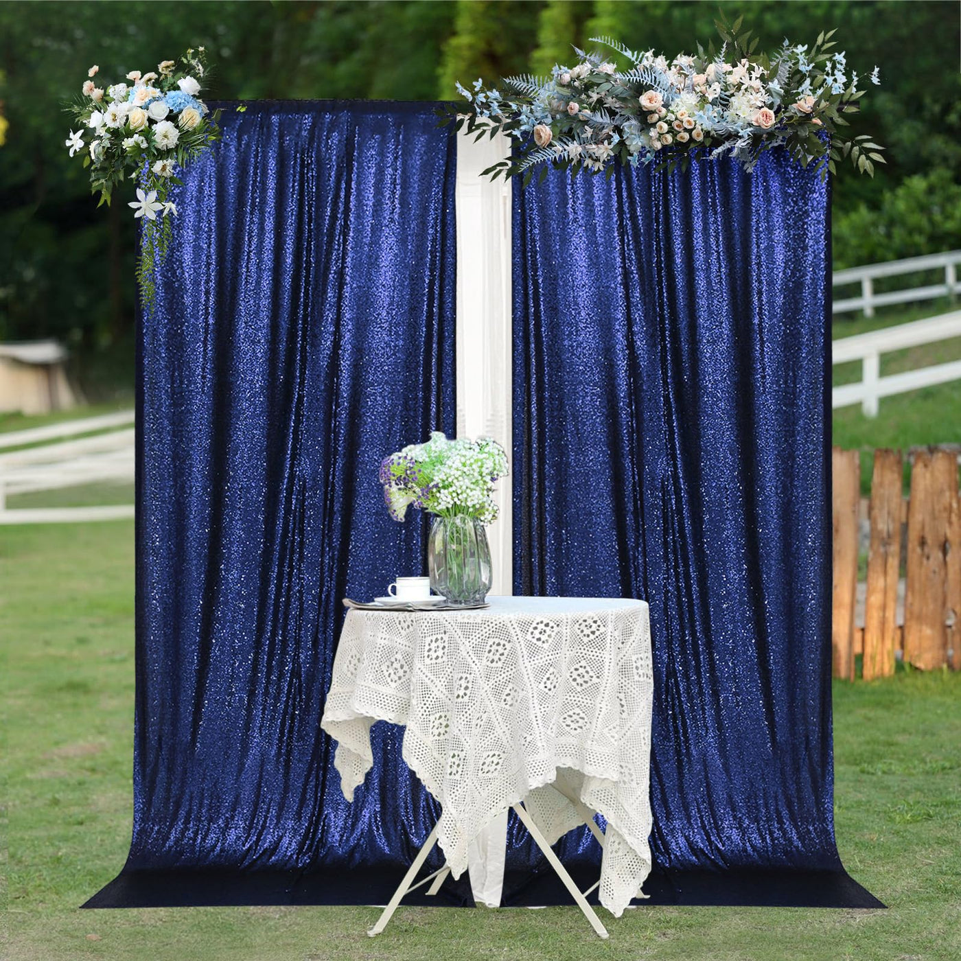 Q: Can this backdrop be used for outdoor events?A: Yes, the PartyDelight Navy Blue Sequin Backdrop is suitable for outdoor events, making it perfect for outdoor weddings, photo shoots, and other celebrations.