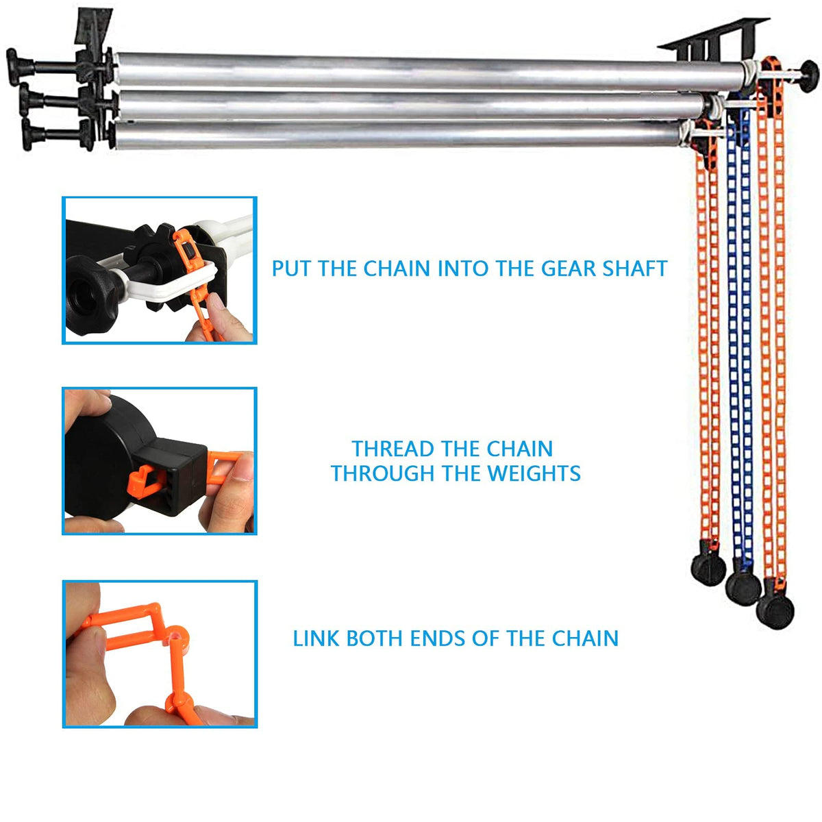 Note: For Safety Reasons, If You Need To Install On The Ceiling, It Is Recommended That The Ceiling Should Be A Concrete Structure, Not A Wooden Ceiling Or Other Ceilings That Are Not Solid.Package Contents:- 2 X Three-Fold Hook- 6 X Expansion Bar- 3 X Chains- 3 X Counterbalance Weights- 8 X Clamp Screwsfeatures:- It Is Ideal For Small Studio Or Home Studio, A Smart Choice For Substitute Of Expensive Electrical Roller System.- Enhanced Safety Compared To Easily Knocked Over Portable Systems.- Durable & Light Weight, Save Space.- Gear Designed Roller Ensures Effortless Raising And Lowering Backgrounds.- Allows You To Easily And Quickly Select And Change Any Of 1 Background.- Perfect For Muslins, Computer-Printed, Canvas And Paper Backgrounds.Product Features: Beautiful And Durable, Easy To Install, Excellent Quality, Simple And Convenient To Useproduct Use: Photo Studio, Photo, Wedding Background, Still Life, Clothing, Bags, Cosmetics, Background Shaftproduct Quality: Metal Hook, High Hardness, Good Wear Resistance, Can Be Installed On The Ceiling, Wall Or Lamp Stand.Exquisite Manual Chain: Interlocking Links, Accidentally Broken, Just Remove The Broken Link, And Then Re-Fasten It, It Can Be Used For A Longer Time.