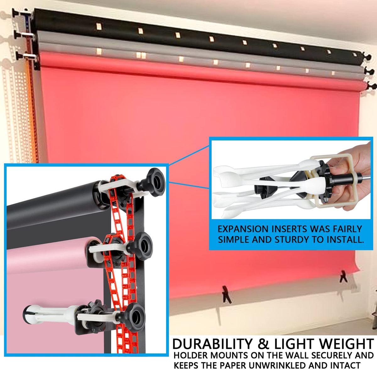 Photography Backdrop Wall Mount 3 Roller Support System, Manual Photo Background Ceiling Holder, Including 2 Tri Fold Hooks, 6 E
