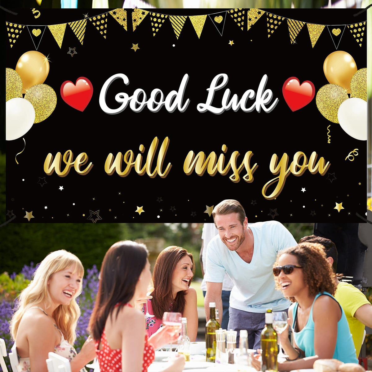 Going Away Party Decorations We Will Miss You Good Luck Banner Material:&Nbsp;Durable Polyester Size:&Nbsp;About 73X 44 Inches. Package Includes: 1 X Banner 1 X Ribbon Features: Clear And Eye-Catching Words ''Good Luck'' And ''We Will Miss You'' Are Added With Red Hearts, Balloons, Triangular Banners And Other Graphic Elements. Both Expresses The Sadness And Heartfelt Wishes To Friends And Family When They Leave, And Also Creates A Warm And Pleasant Party Atmosphere For You. Usage Method: Use The Rope To Go Through The Hole In The Corner Of The Banner And Hang It. Multiple Occasions: Great For Farewell Party,Retirement Party, Graduation,Goodbye Party, Job Change Party Decoration And Other We Will Miss You Themed Party Decorations. Can Be Hung On Dessert Tables, Buffet Tables, Gift Tables, Walls, Mantels, Fences And More. It Is Also A Good Photo Prop.