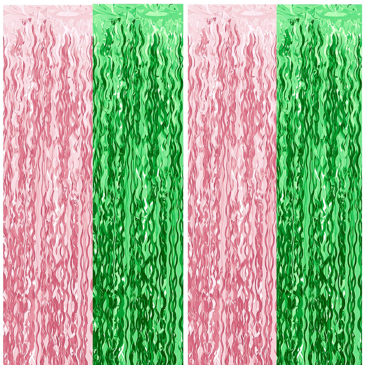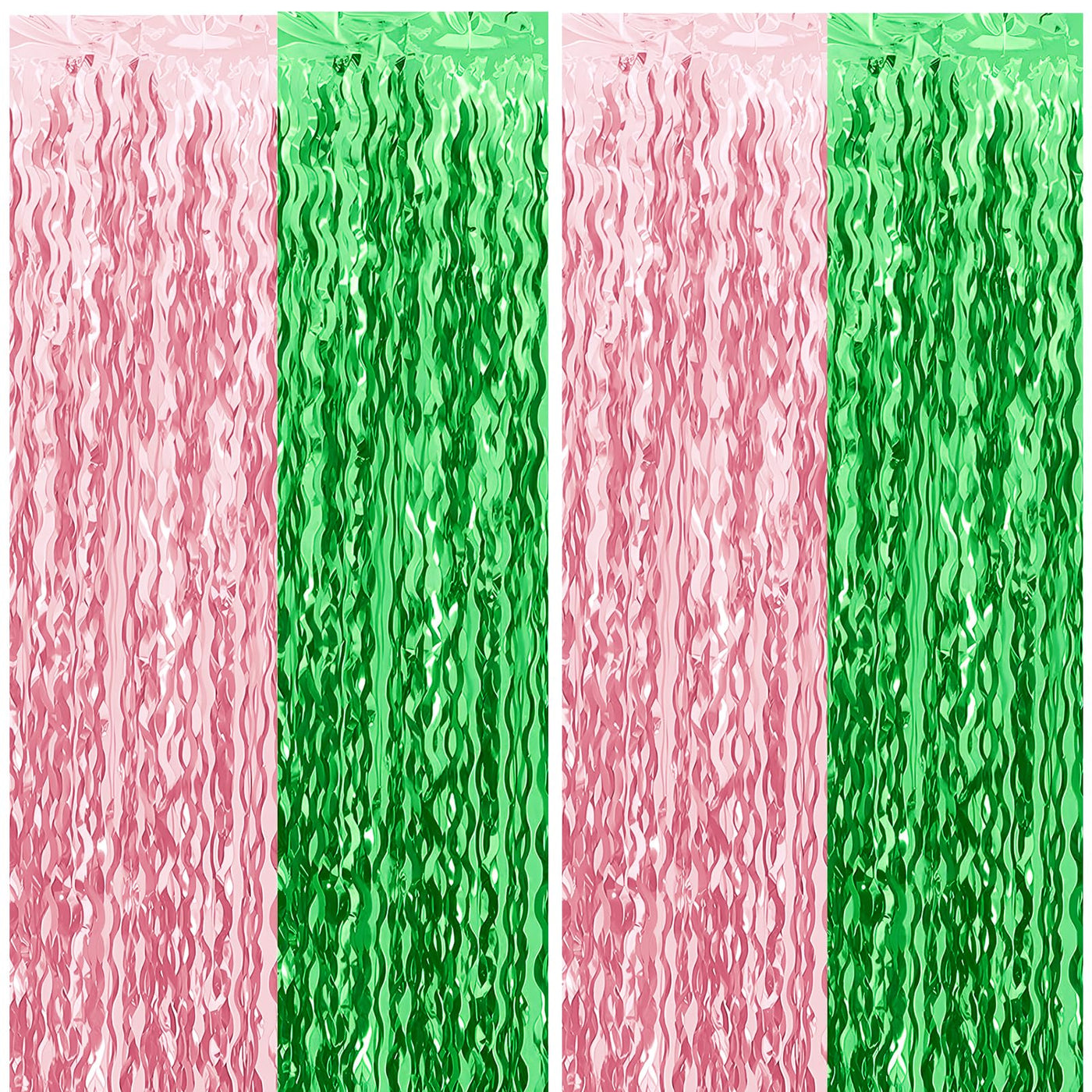 Pink And Green Wavy Tinsel Foil Fringe Curtains Photo Booth Backdrop For Green Pink Theme Birthday Party Witch Decorations(2 Pac