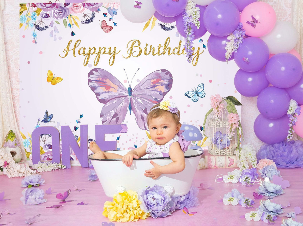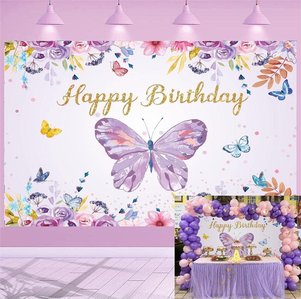 Purple Butterfly Birthday Backdrop Spring Pink Rose Floral Pastel Butterfly Photography Background Girls Princess Birthday Party