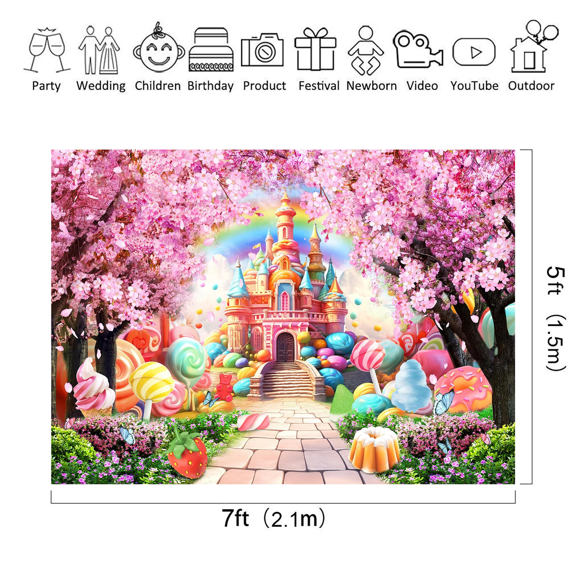 Q: What are the dimensions of the Riyidecor Princess Candyland Castle Backdrop?A: The backdrop measures 7 feet wide by 5 feet high (7Wx5H), making it ideal for various photography settings.