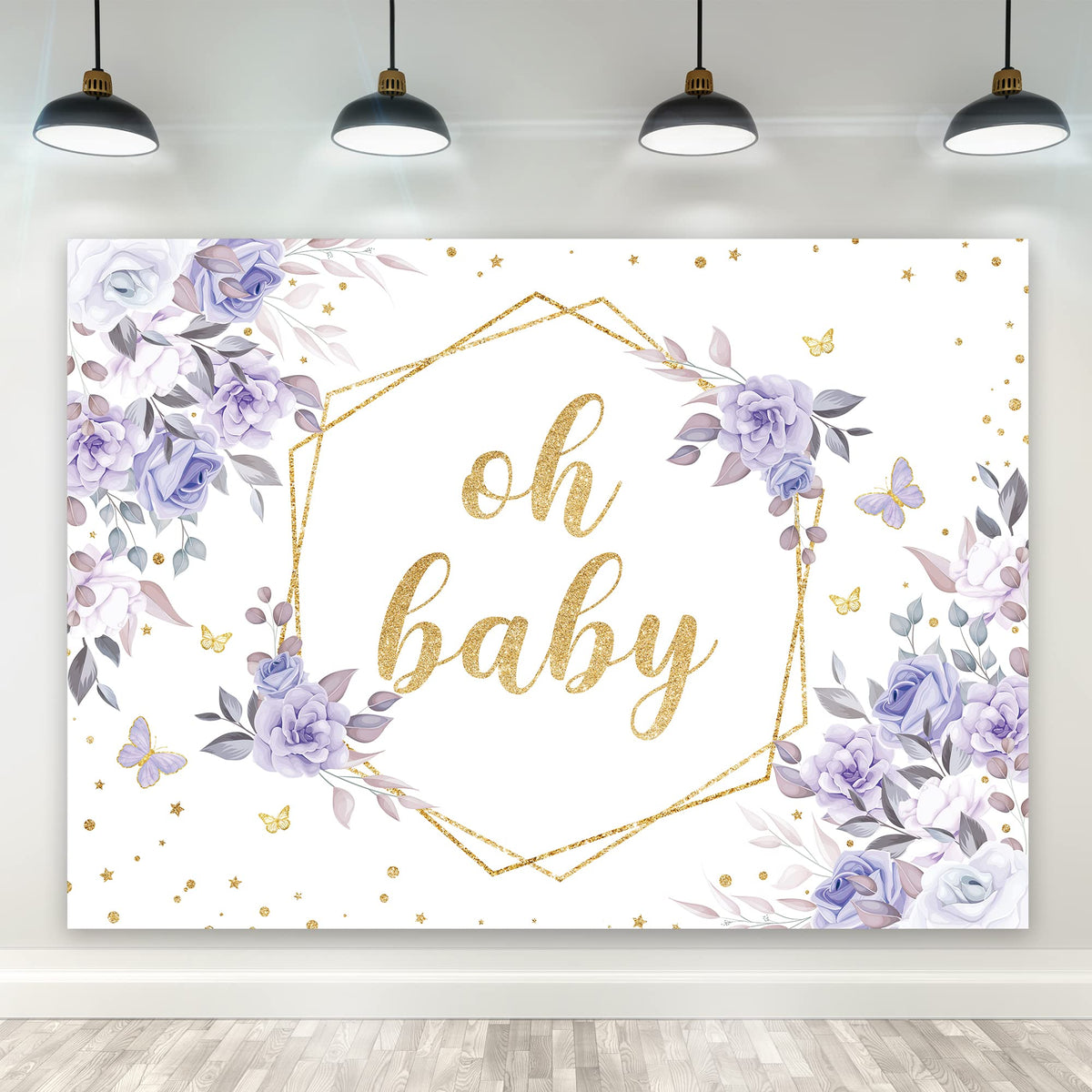 Q: What are the dimensions of the Riyidecor Purple Floral Butterfly Oh Baby Backdrop?A: The backdrop measures 7 feet wide by 5 feet high (7Wx5H), making it suitable for various photography needs including baby showers and newborn parties.
