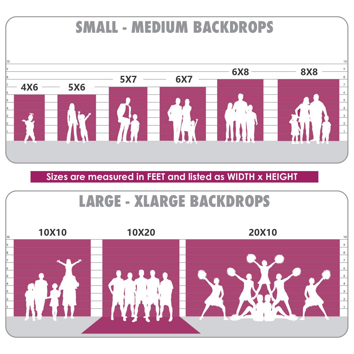 Q: What are the ideal sizes for this backdrop based on the number of people?A: For optimal use, the recommended backdrop sizes are: 1-2 people = 4ft-5ft wide, 2-4 people = 6ft-8ft wide, 4+ people = 8ft-10ft wide, and for extra-large groups, a backdrop of 20ft wide is suggested.