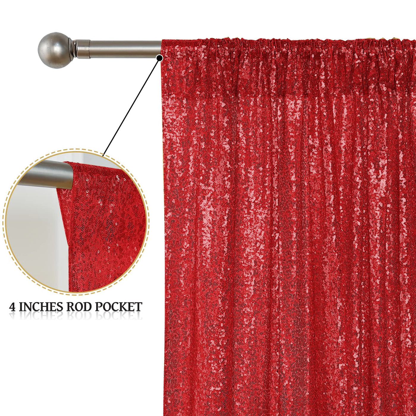 Q: Is the red sequin backdrop easy to install?A: Yes, the backdrop curtains feature a 4-inch wide rod pocket on the top, making them very easy to install for any occasion.