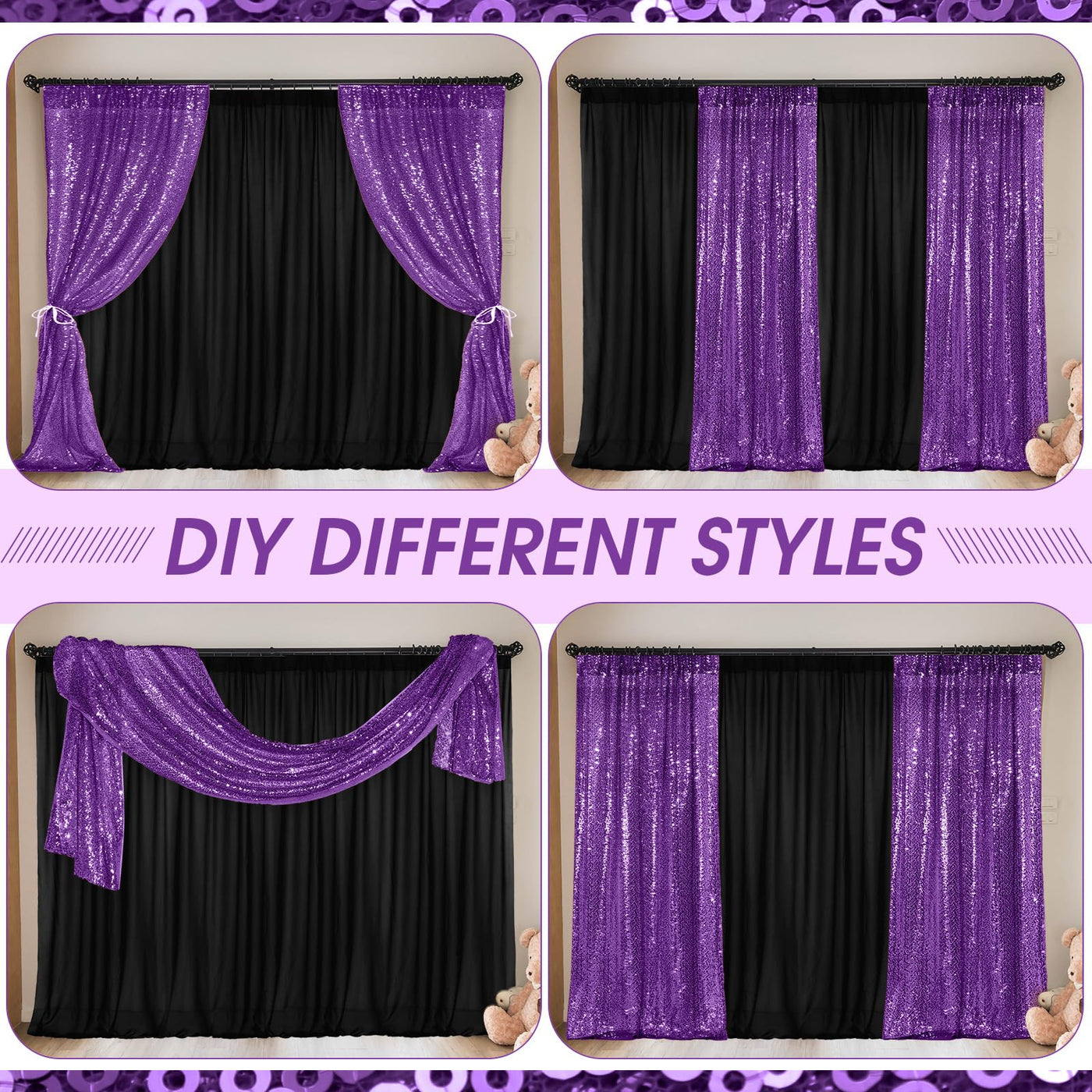 Q: What are the dimensions of the backdrop curtains included in the package?A: The package includes two sheer chiffon backdrop curtains measuring 3.5 ft (w) x 10 ft (h) and two sequin photo backdrop curtains measuring 2 ft (w) x 10 ft (h). Together, they create an overall backdrop size of 11 ft (w) x 10 ft (h).
