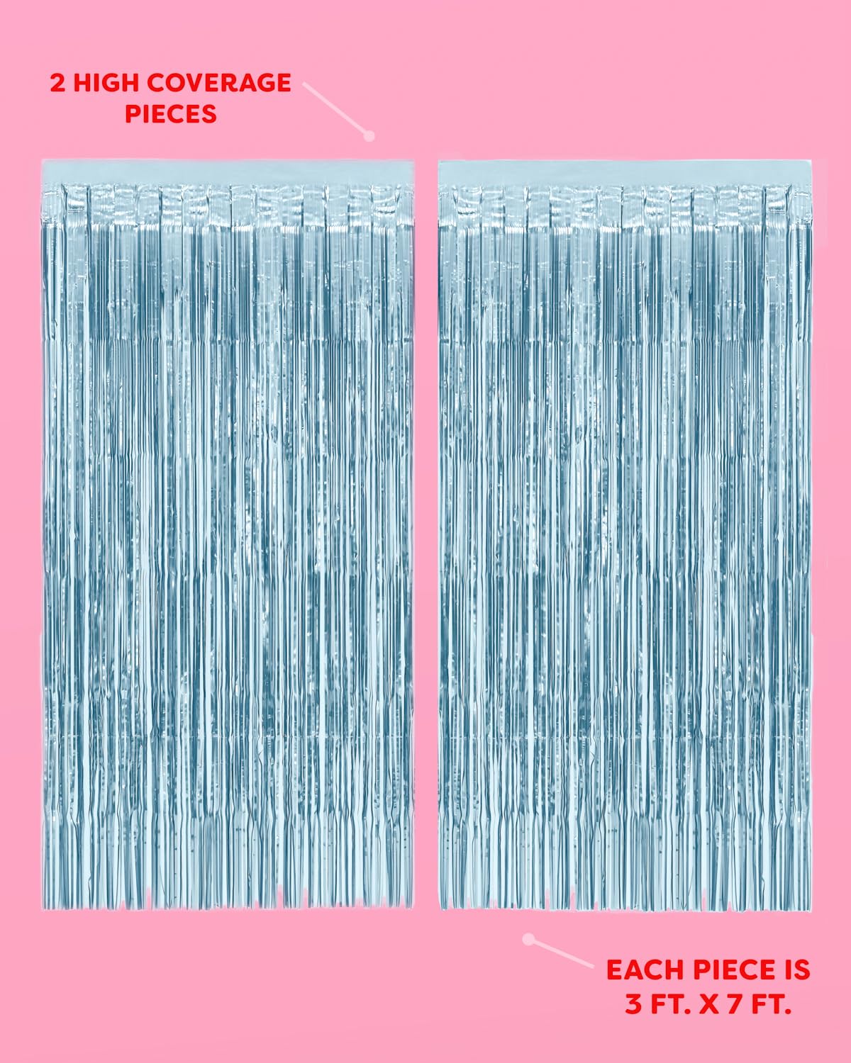 Q: What events are these matte blue fringe foil curtains suitable for?A: These matte blue fringe foil curtains are perfect for a variety of events such as bachelorette parties, bridal showers, birthday celebrations, gender reveals, and holiday parties. They create a fun and vibrant backdrop for any occasion.