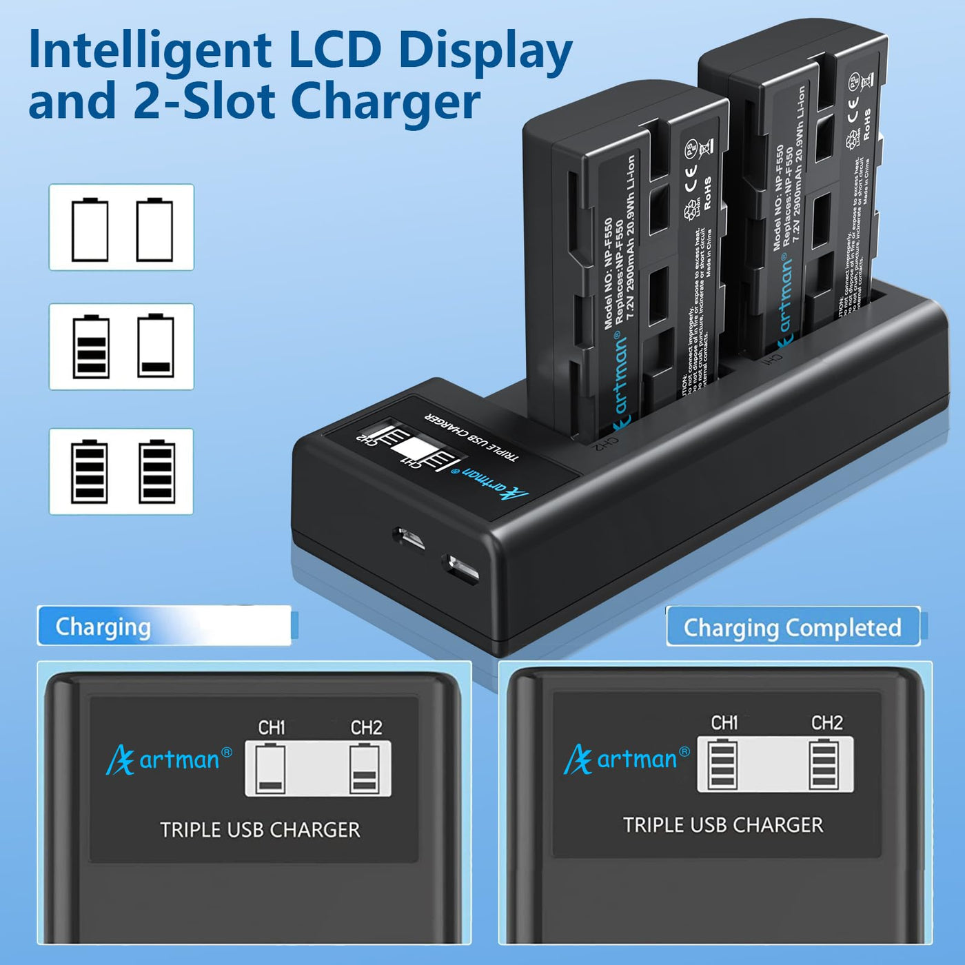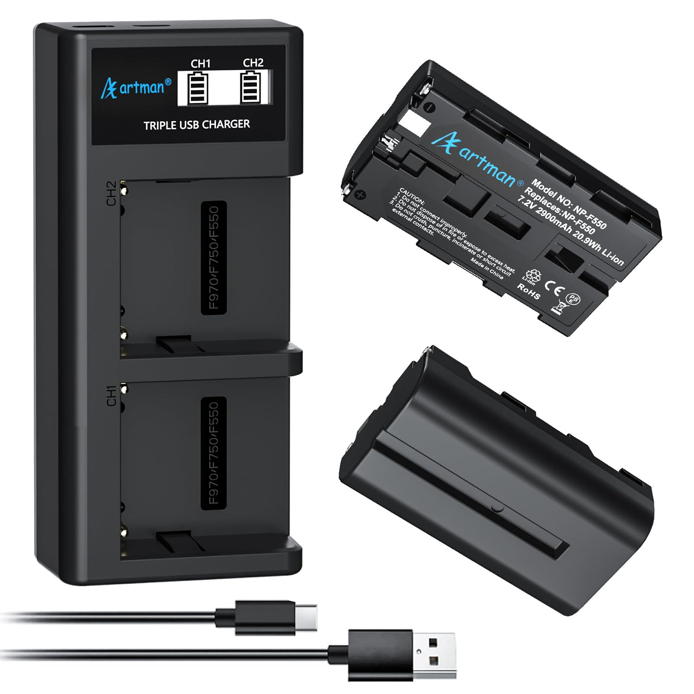 Q: What charging options are available for the Artman NP-F550 battery?A: The Artman NP-F550 battery can be charged using a dual USB charger that supports both Micro-USB and Type-C inputs, allowing you to use various power sources like wall chargers, laptops, car adapters, and power banks.
