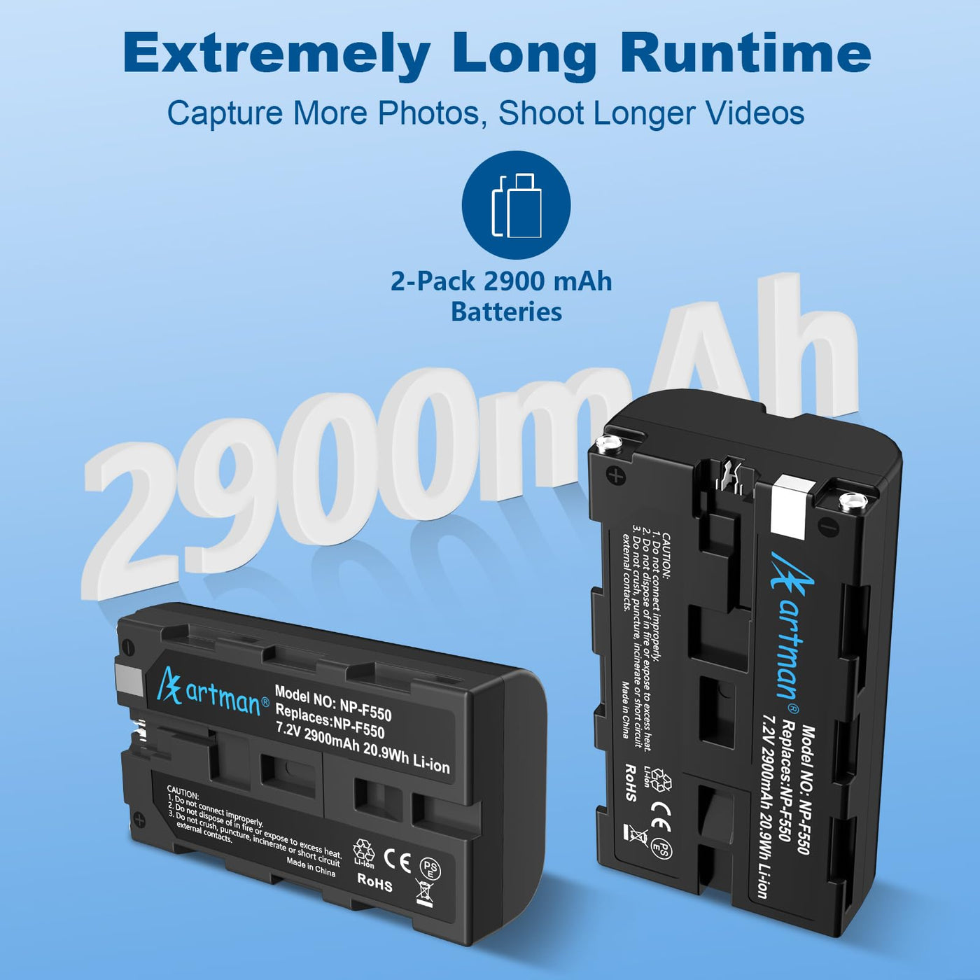 Q: Is the Artman NP-F550 battery safe to use?A: Yes, the Artman NP-F550 battery is equipped with an intelligent chip that ensures safety features such as over-voltage, over-current, short circuit, high-temperature, and over-charge protection.