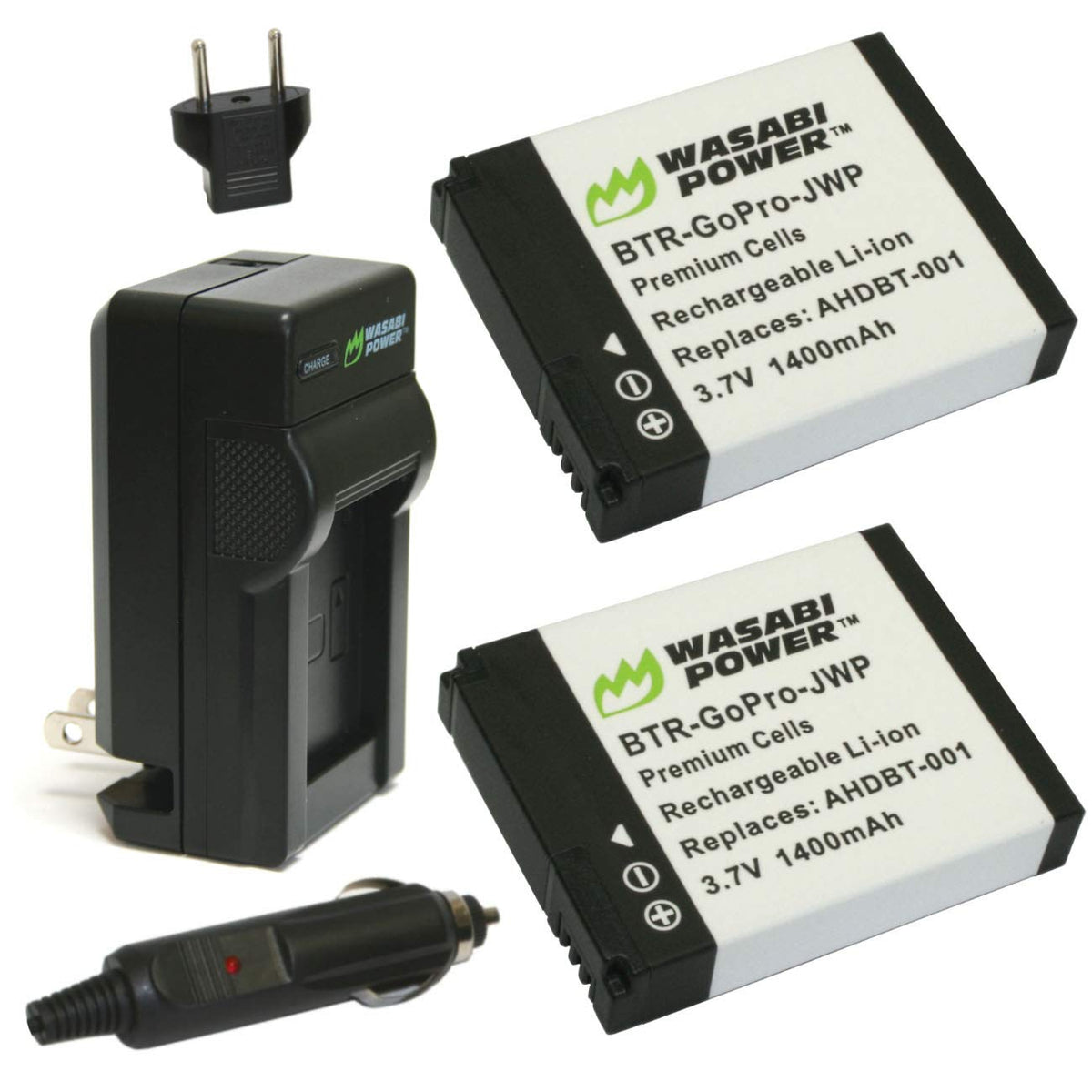 This Wasabi Power Go Pro Hero/Hero2 Charger With 2 Li-Ion Batteries Kit. Each Wasabi Power Battery Features Japanese 3.7-Volt, 1,400 Milliamp Hour Cells. The Mini Rapid Ac Charger Features A Foldout Us Plug, 110-Volt To 240-Volt Input, Car Charging Adapter And European Plug. Batteries And Chargers Are Fully Compatible With The Go Pro Original Battery And Charger. All Items Include A 3-Year Manufacturer Warranty.