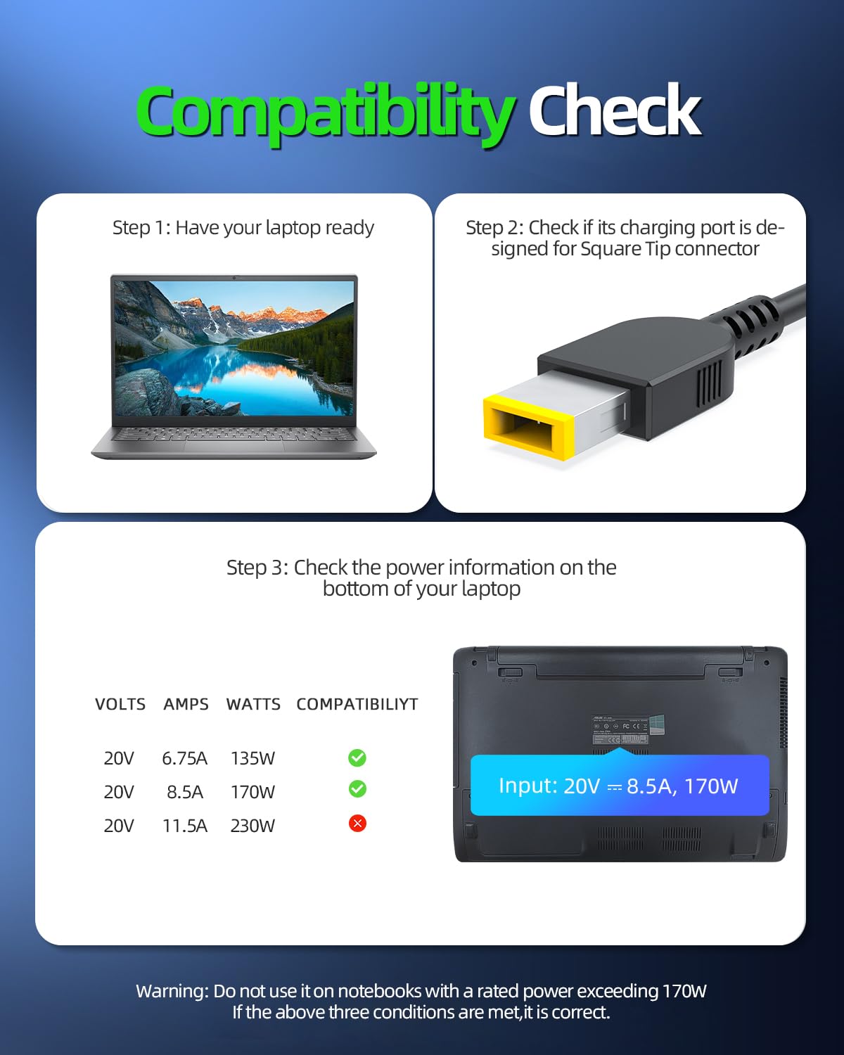 Fit For All 170W/135W Lenovo Thinkpad Yoga Legion Laptops With Square Tip Power Connector, Model E.G. Thinkpad P1 P50 P51 P52 P53 P70 P71 P73 W540 W541 T540P Gen 1 2 3 4 4X20E50574 And More.